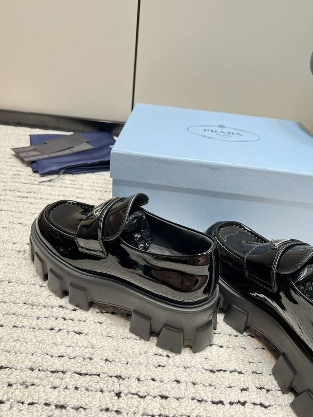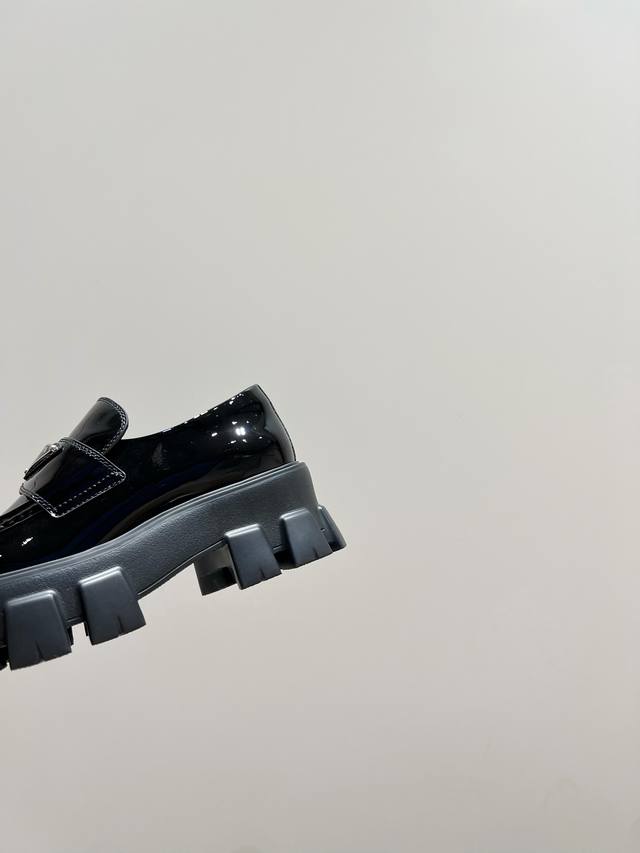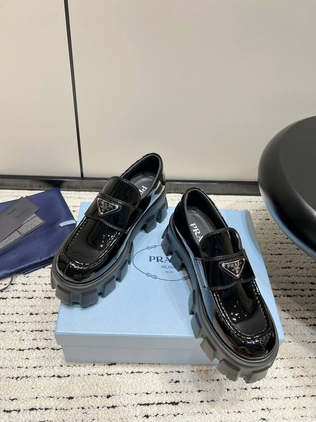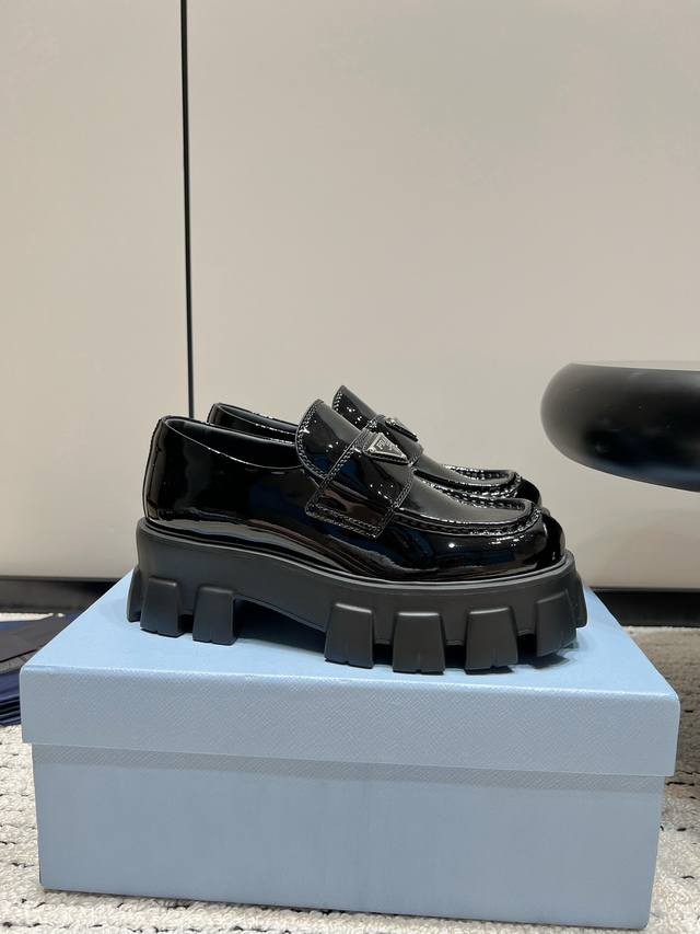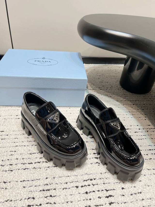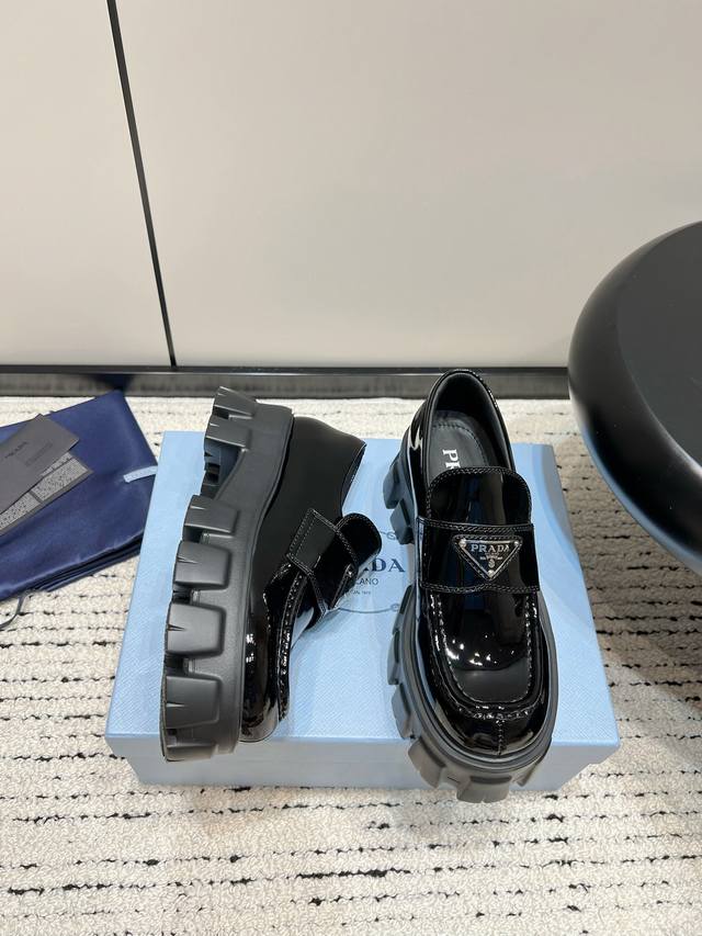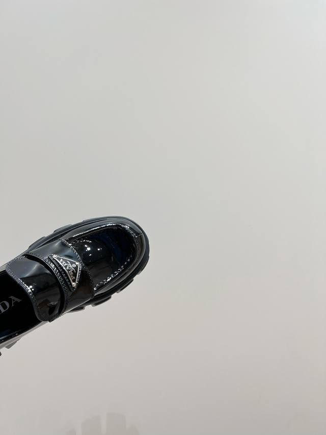 出厂价Pp: 普拉达 松糕厚底乐福鞋 鞋面:进口开边珠牛皮 牛漆皮 内里:羊皮+羊皮踮脚 大底:原版开模松糕大底 跟高:4Cm...