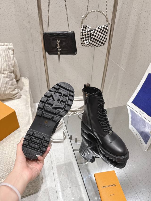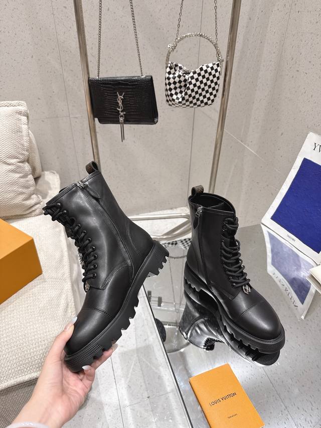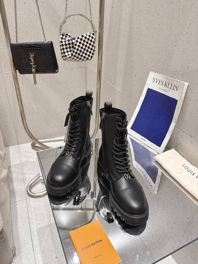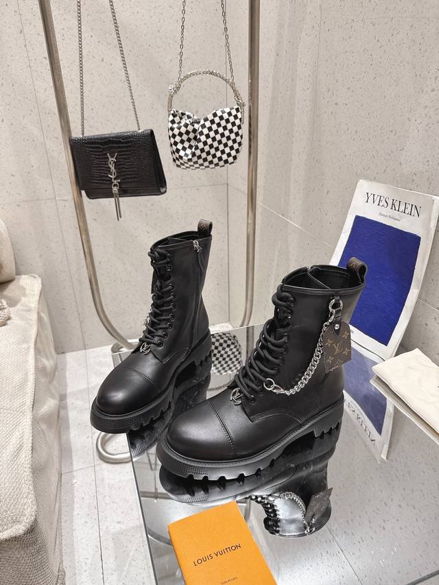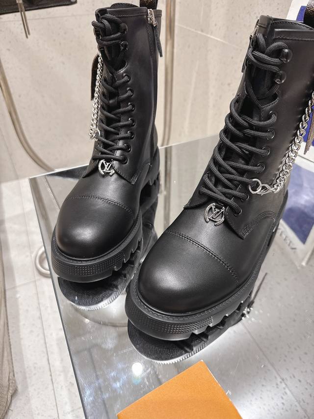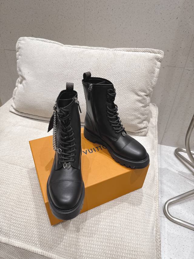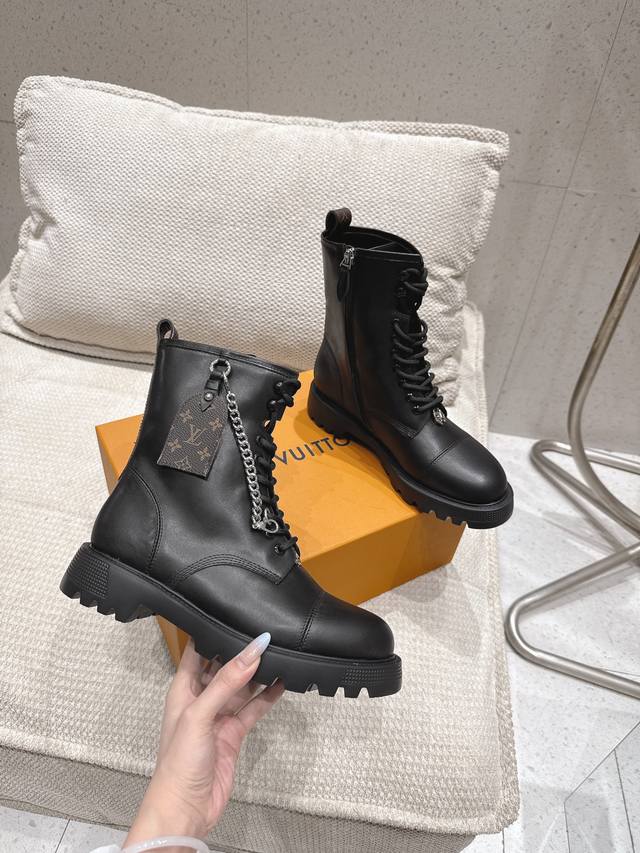 代购级!全配套包装 本款 District Ranger 及踝靴承载军旅灵感和路易威登的旅行传承,为舒软牛皮革鞋面点缀金属链条和 Monogram 帆布制成的行李牌形状挂饰。Eva 外底拥有细致凸纹,厚实而不失轻盈。 材料:小牛皮 内里: 进口羊皮 垫脚:羊皮 大底:Eva大底 跟高:4Cm 鞋码: 35-41 40.41.定做不退换