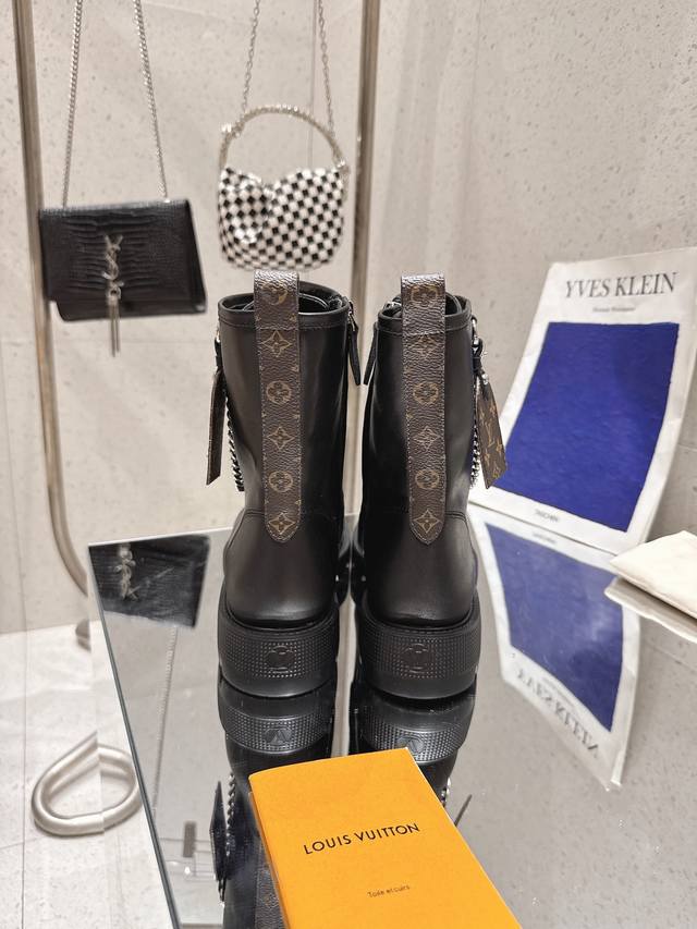 / 代购级!全配套包装 本款 District Ranger 及踝靴承载军旅灵感和路易威登的旅行传承,为舒软牛皮革鞋面点缀金属链条和 Monogram 帆布制成的行