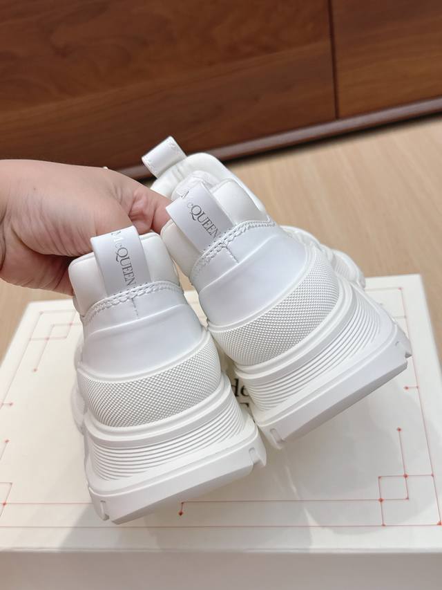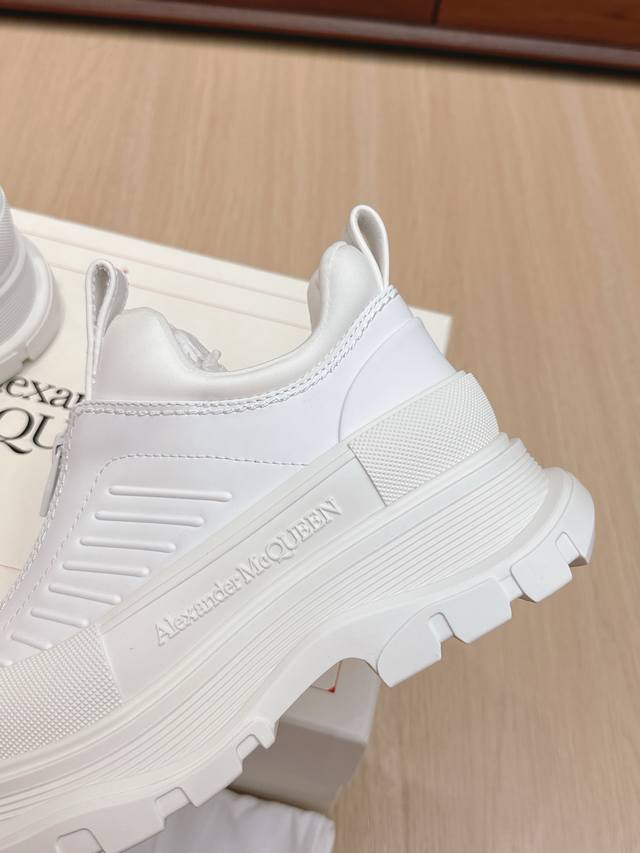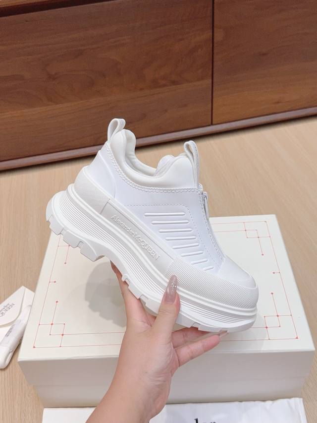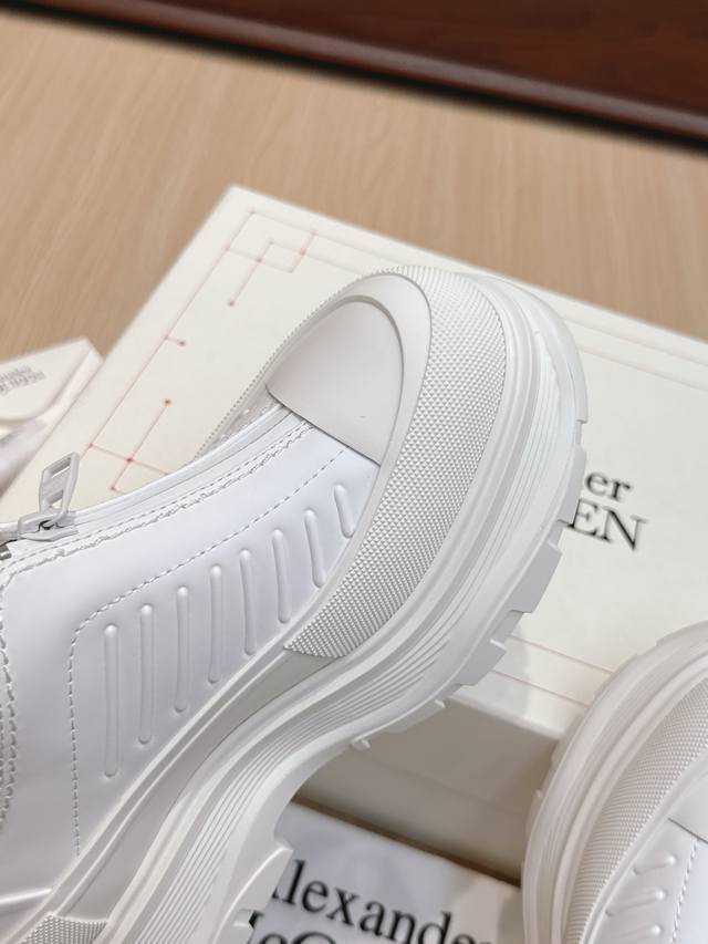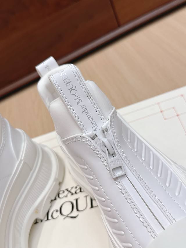代购级 男+10 #麦昆情侣皮面拉链休闲短靴! 这款Tread Slick靴子采用黑色牛皮革制成,鞋面配有外露式银色机车风格拉链,纹理橡胶包边和同色调Alexander Mcqueen标识,搭配轻盈超大橡胶厚底,拉链开合,圆头设计,纹理橡胶包边,背面银箔标识! 值得疯抢的魅力款式,是它拥有今年主流元素切尔西风格又不失麦昆独有的休闲时尚,上脚超有风范,上脚让人特好看的感觉,切尔西靴不用以往的中性风格,可以说不输任何品牌的马丁靴,潮人百搭款,耐穿又轻便不累脚,好看是毋庸置疑! 面料进口小牛皮,质感柔软,内里垫