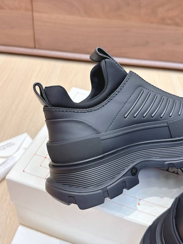 代购级 男+10 #麦昆情侣皮面拉链休闲短靴! 这款Tread Slick靴子采用黑色牛皮革制成,鞋面配有外露式银色机车风格拉链,纹理橡胶包边和同色调Alexander Mcqueen标识,搭配轻盈超大橡胶厚底,拉链开合,圆头设计,纹理橡胶包边,背面银箔标识! 值得疯抢的魅力款式,是它拥有今年主流元素切尔西风格又不失麦昆独有的休闲时尚,上脚超有风范,上脚让人特好看的感觉,切尔西靴不用以往的中性风格,可以说不输任何品牌的马丁靴,潮人百搭款,耐穿又轻便不累脚,好看是毋庸置疑! 面料进口小牛皮,质感柔软,内里垫