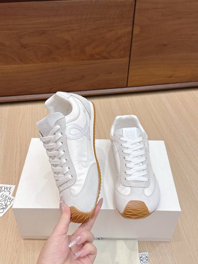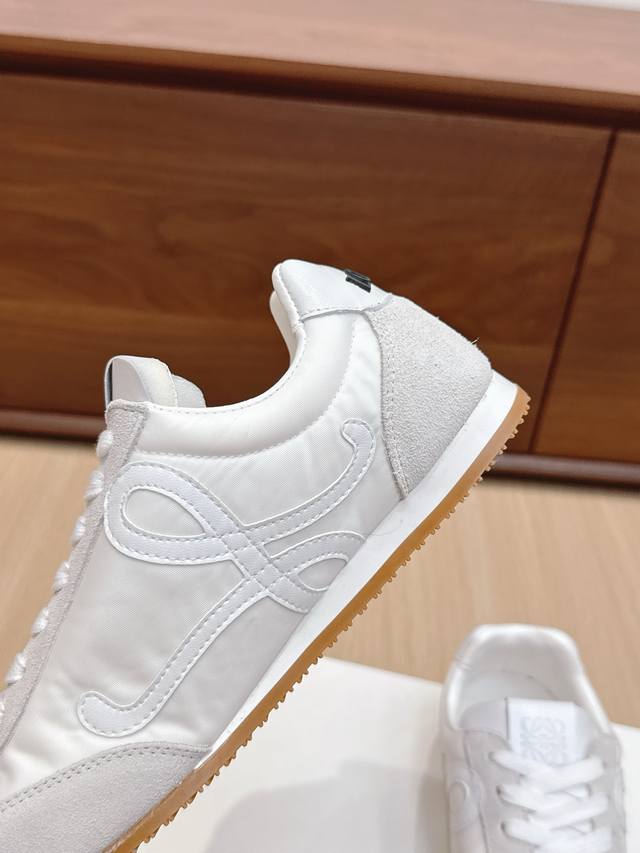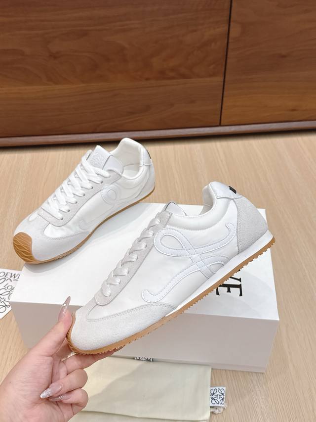 代购级 #罗意威新款大头运动鞋Ballet Runner2.0芭蕾阿甘鞋,鞋头的设计更有趣味性,脚后跟设计新颖 柔软舒适,这款阿甘鞋会被评为年度最舒适的暴走鞋 ,如履平地 !运动鞋建议正码 鞋子呈简约利落的低帮鞋型,侧面有品牌Logo的首字母,最重要的一点 ,穿上这款鞋就一定会爱上,而且再也无心选备其他运动风了。 材质介绍 : 鞋面由进口牛绒+小牛皮+风衣布 拼接而成 很考验针车走线的技术哟 ,原版定制磨具大底! 配齐包装 舒适 简约 百搭 暴走阿甘鞋 ,设计灵感来源于芭蕾舞鞋和20世纪70年代的鞋履风格