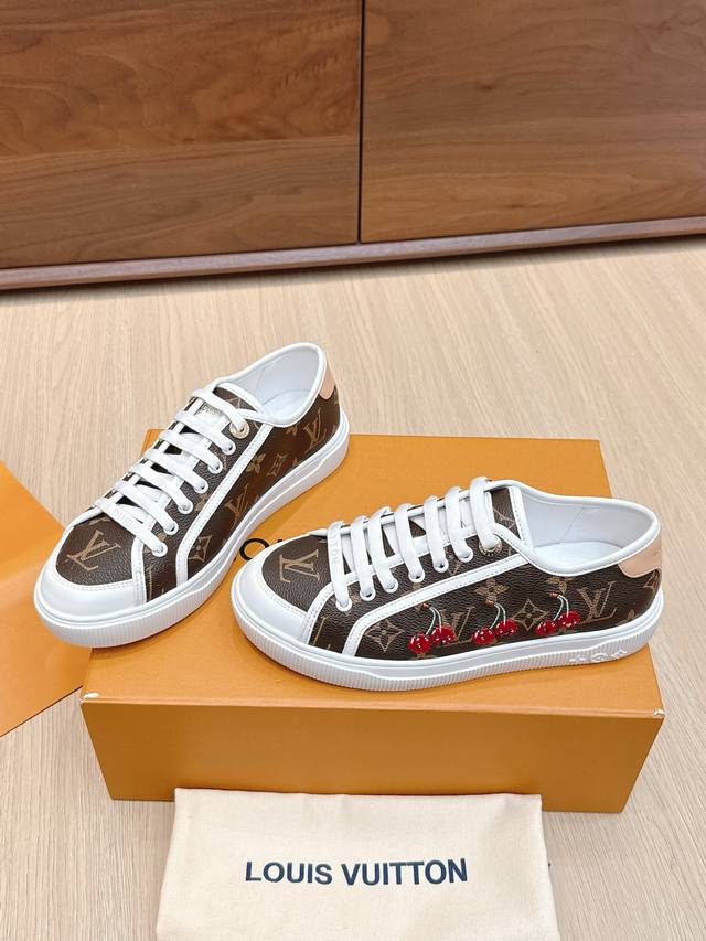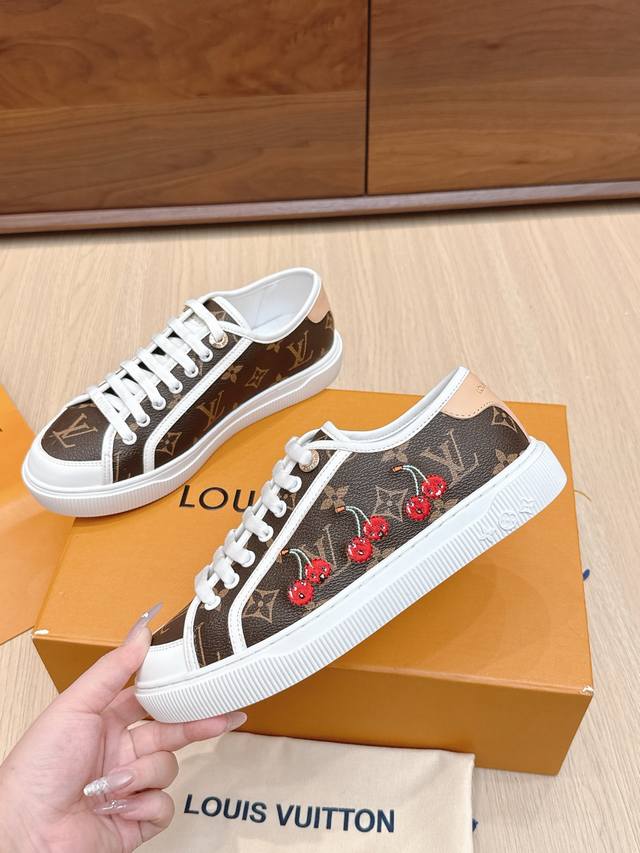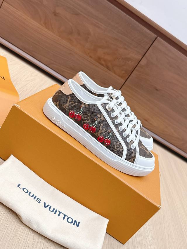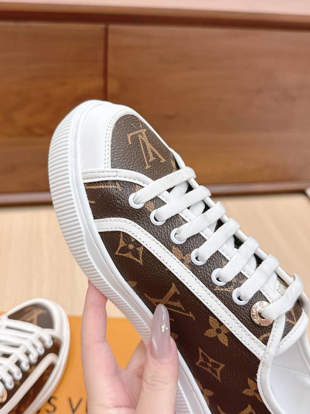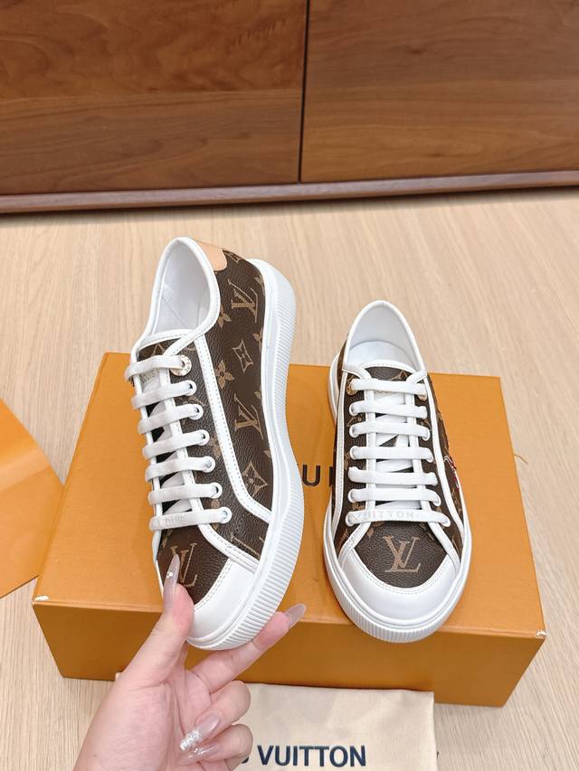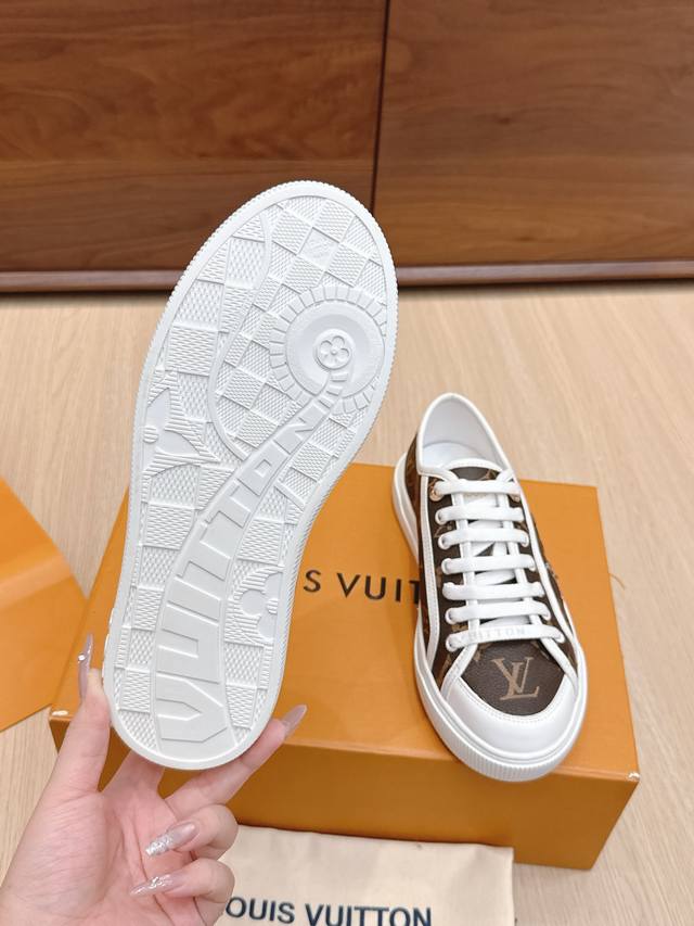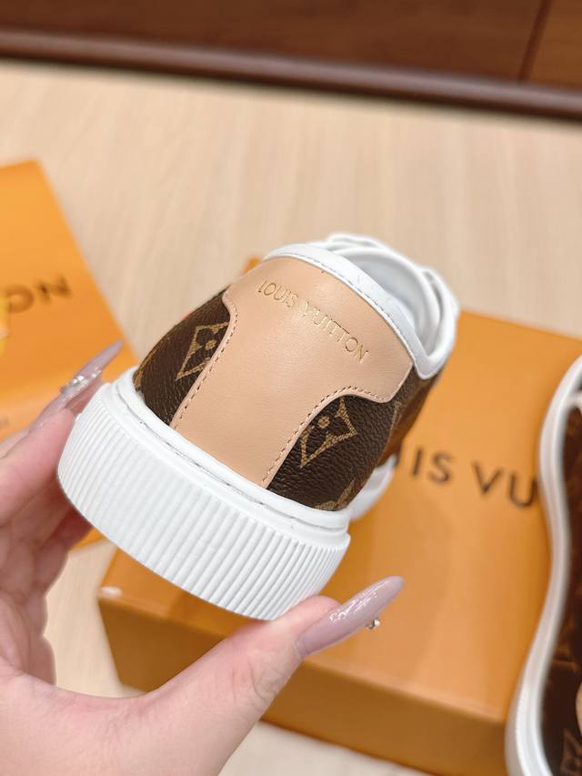 / 代购级 路易威登春夏新款休闲运动板鞋 具有青春气息的洋溢气息,上脚非常减龄!上脚舒适轻便!颜色也非常青春!鞋面专属于Lv的金色饰品穿插!让整个鞋子就更灵动起来!