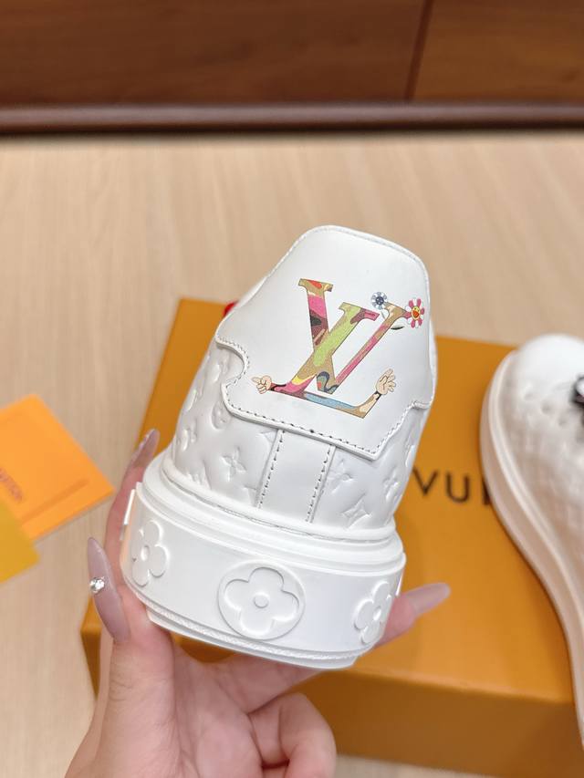 代购级 配饰60 Lv X Tm村上隆 联名款 驴牌 L家 Time Out 系列 压花 浮雕 吊坠 休闲 小白鞋 运动鞋 原版购入开发 做货 本款 Time Out 运动鞋传递路易威登 X 村上隆再版系列的动感风范,为鞋面点缀全幅 Monogram 凸纹,再以鞋舌和鞋跟的缤纷 Lv 字母道出艺术家的“超扁平”美学。鞋带标注趣意盎然的可拆卸皮革贴饰 配送专柜精美包装 面料: 原版进口头层牛皮 内里:原版定制柔软羊皮 鞋底:原版开模Tpu防滑大底 底厚:4Cm Size: 女款35-40 定制41