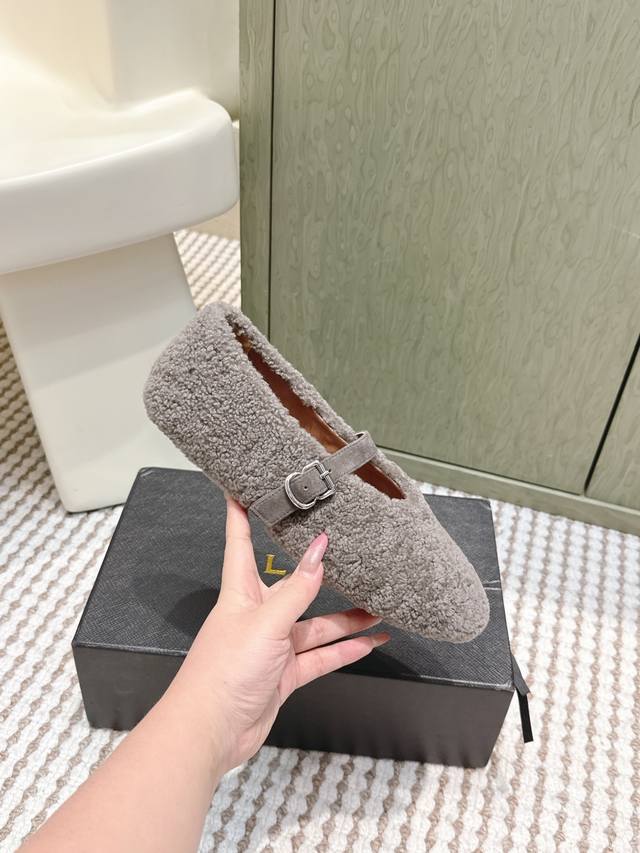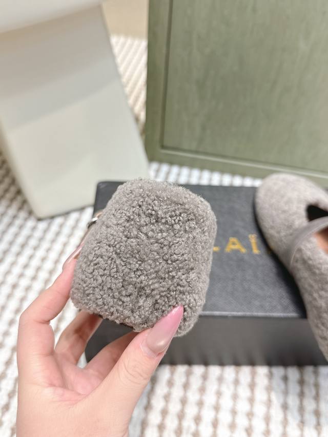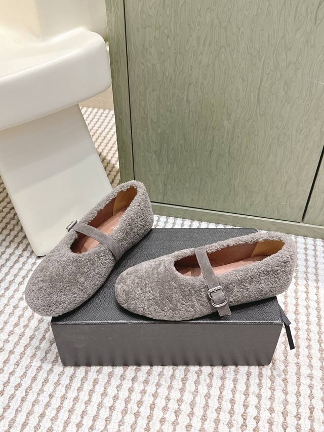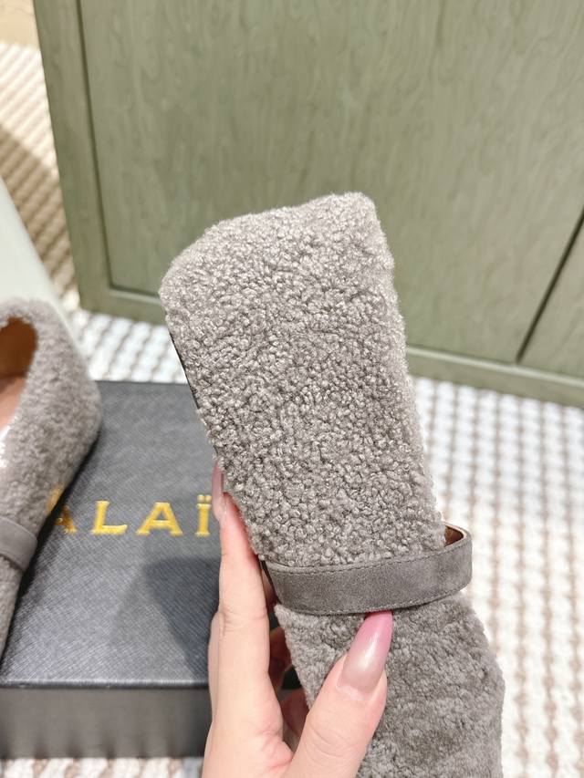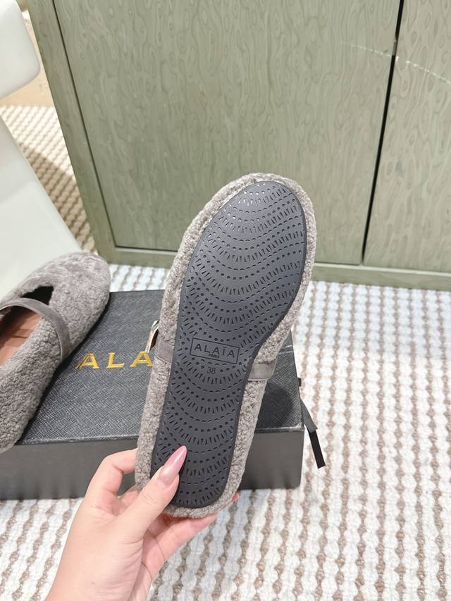 / 代购级 Alaia 秋冬新款羊毛玛丽珍鞋芭蕾鞋 采用反绒面料搭配羊羔毛内里,保暖性强;一字扣带设计,金属扣具提升质感,兼具复古与精致感。圆头版型包容脚型,平底设