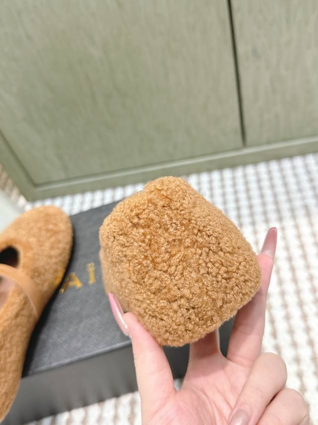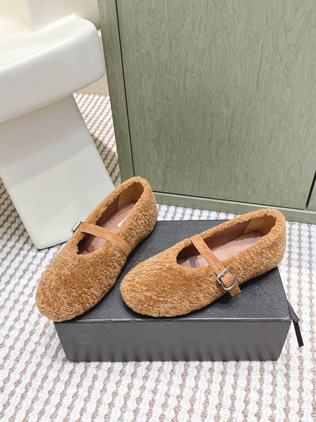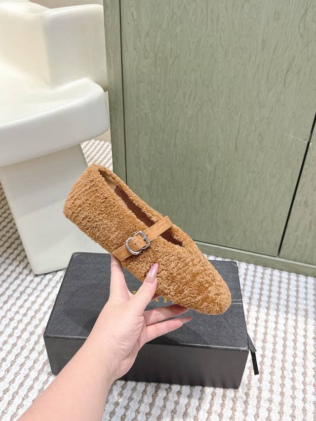 代购级 Alaia 秋冬新款羊毛玛丽珍鞋芭蕾鞋 采用反绒面料搭配羊羔毛内里,保暖性强;一字扣带设计,金属扣具提升质感,兼具复古与精致感。圆头版型包容脚型,平底设