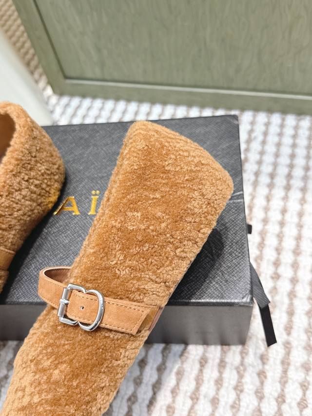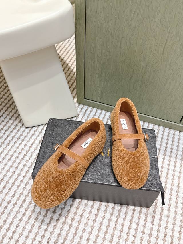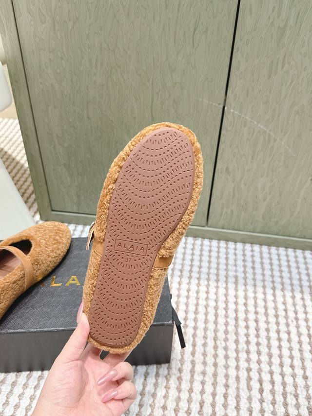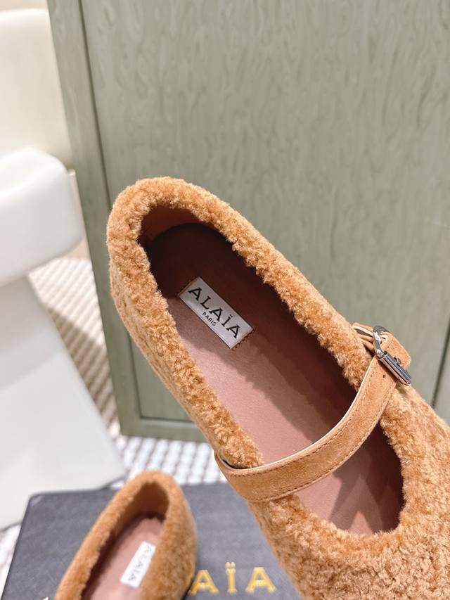 / 代购级 Alaia 秋冬新款羊毛玛丽珍鞋芭蕾鞋 采用反绒面料搭配羊羔毛内里,保暖性强;一字扣带设计,金属扣具提升质感,兼具复古与精致感。圆头版型包容脚型,平底设