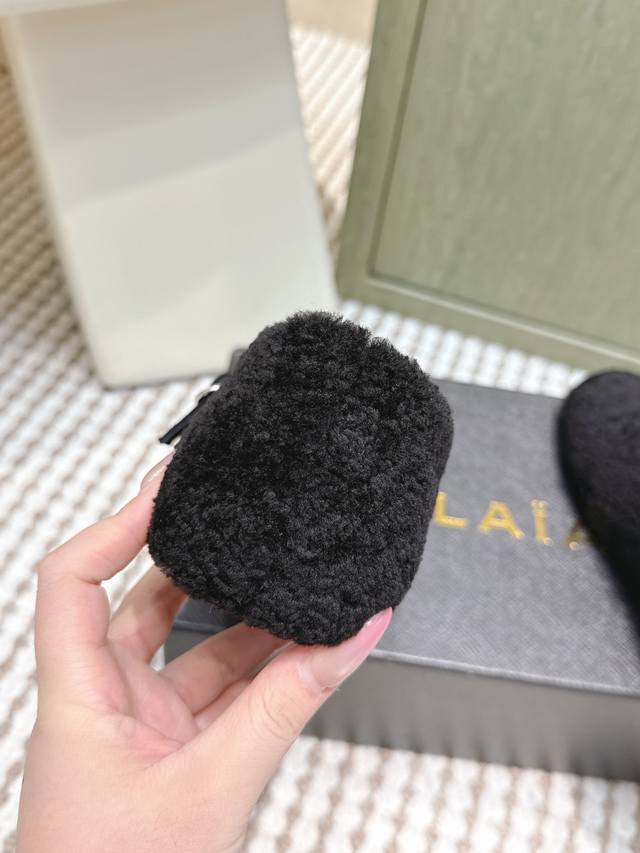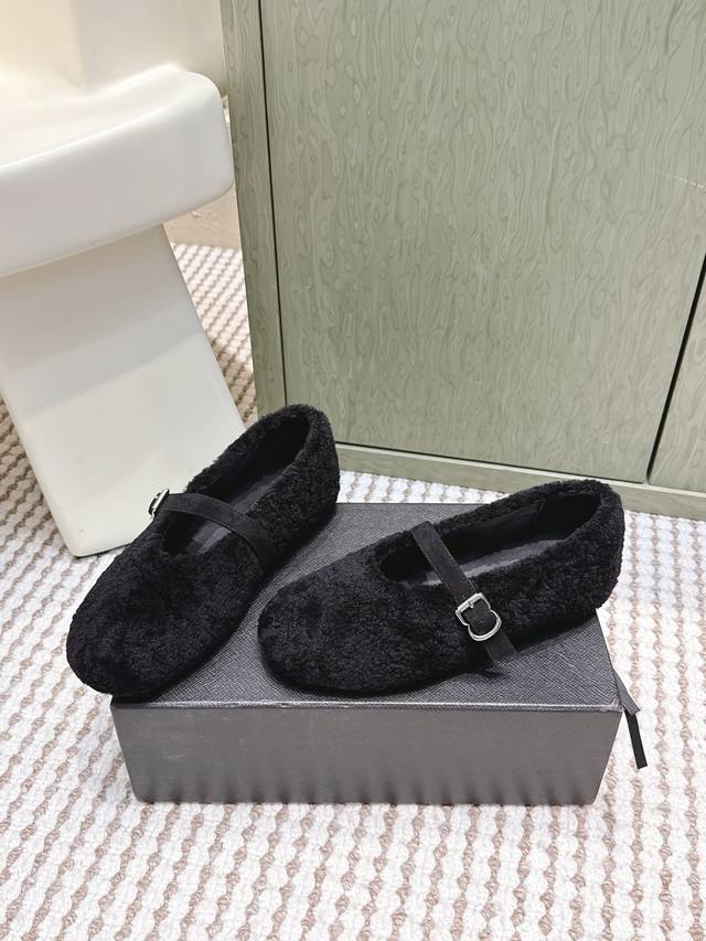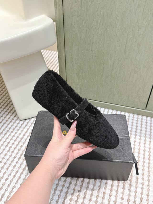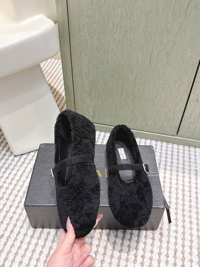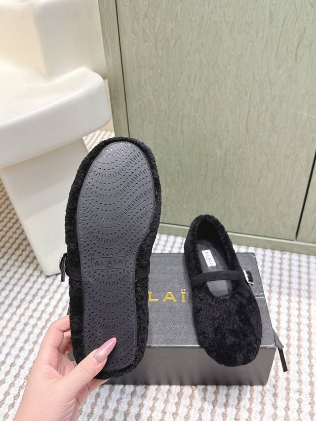 代购级 Alaia 秋冬新款羊毛玛丽珍鞋芭蕾鞋 采用反绒面料搭配羊羔毛内里,保暖性强;一字扣带设计,金属扣具提升质感,兼具复古与精致感。圆头版型包容脚型,平底设