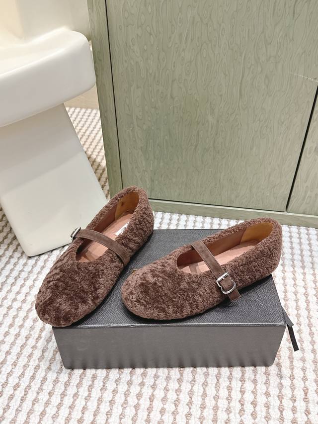 / 代购级 Alaia 秋冬新款羊毛玛丽珍鞋芭蕾鞋 采用反绒面料搭配羊羔毛内里,保暖性强;一字扣带设计,金属扣具提升质感,兼具复古与精致感。圆头版型包容脚型,平底设