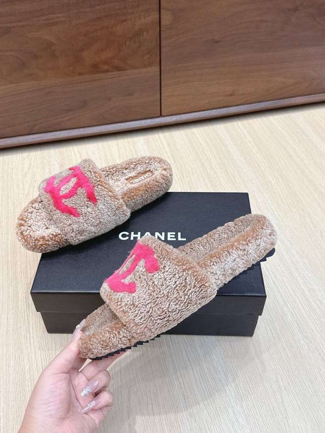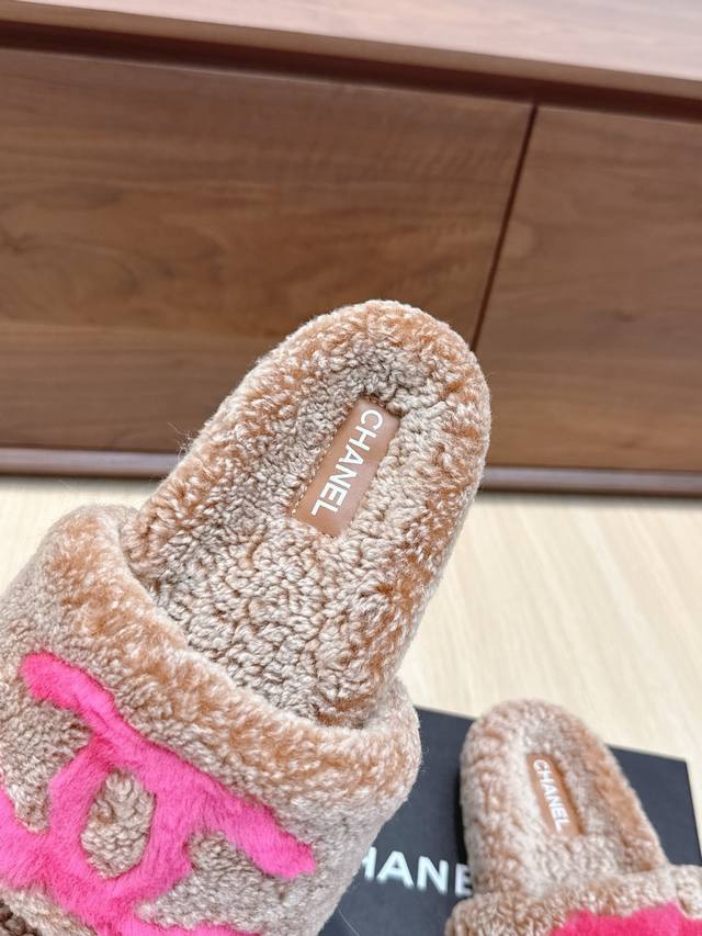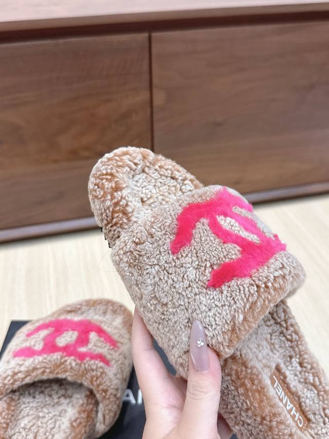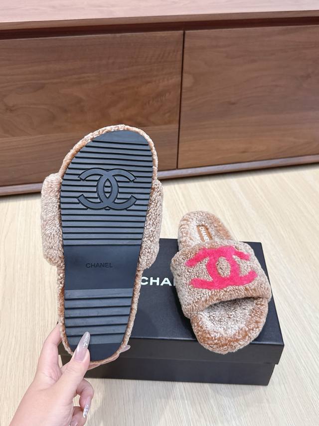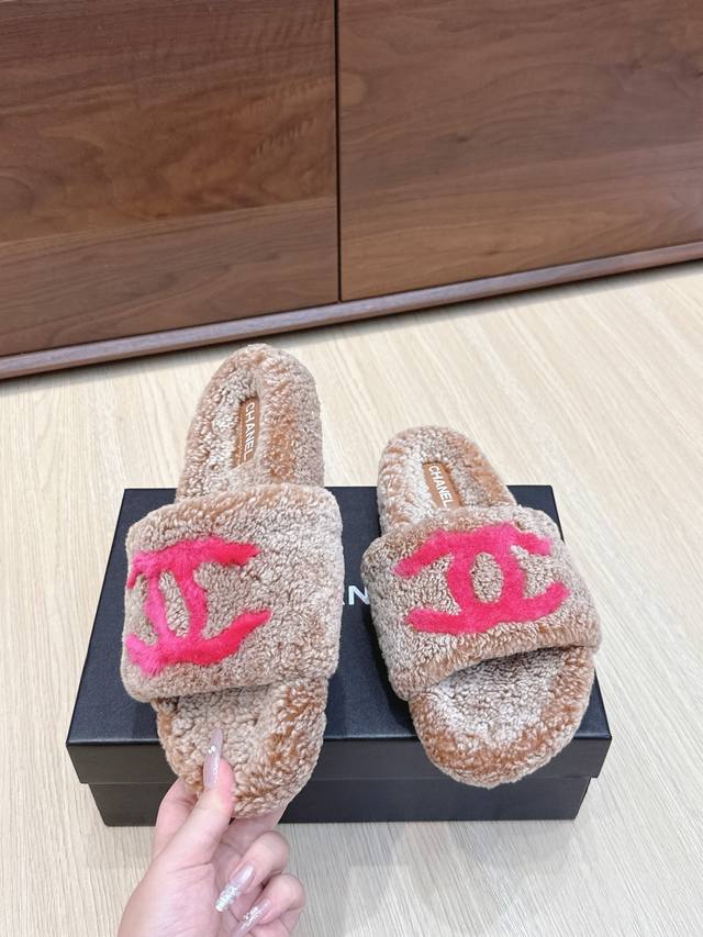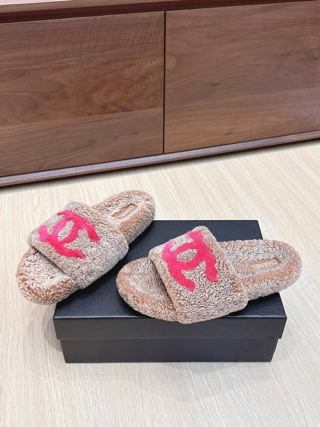 代购级 Chanel 经典四季双C毛毛拖鞋!这款毛拖真的是真太可爱了~ 柔软蓬松的毛毛,舒服暖脚 秋冬搭配袜子休闲又慵懒 上脚真的好看又时髦 进口羊毛,手感细腻