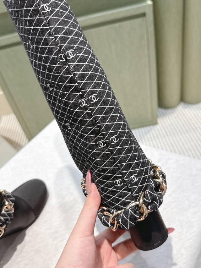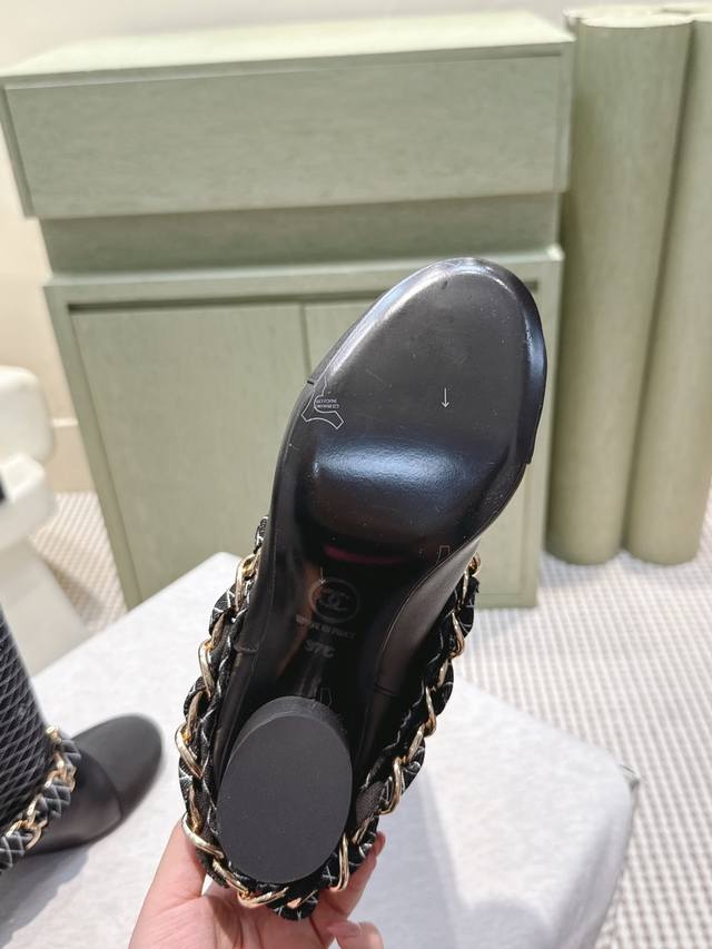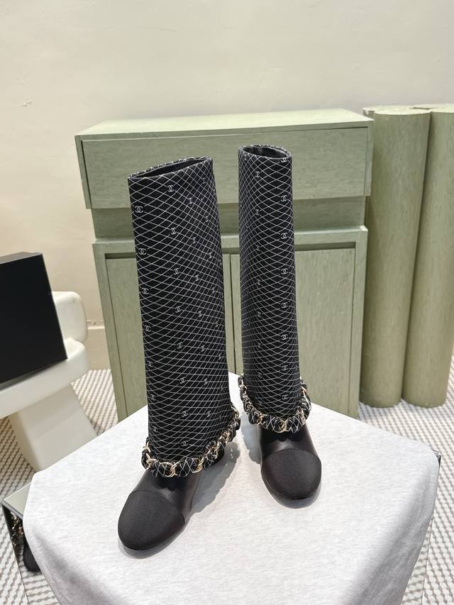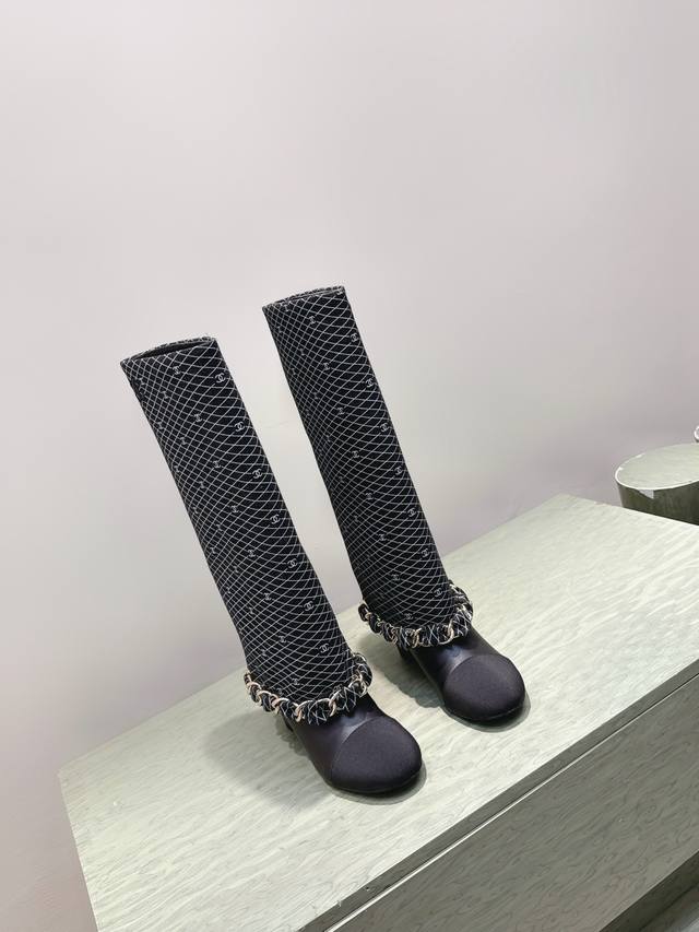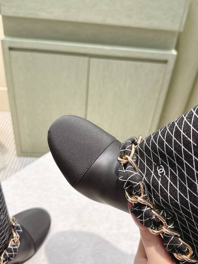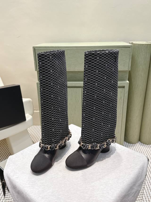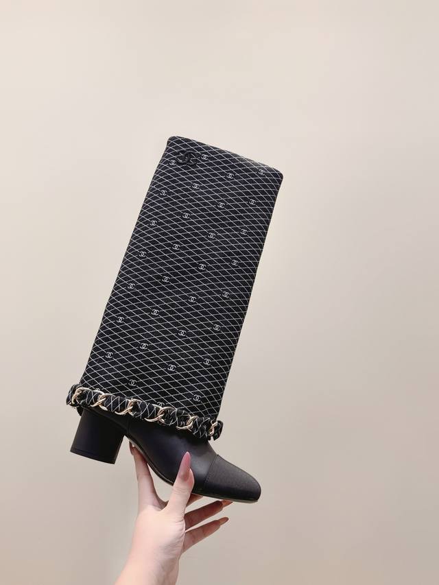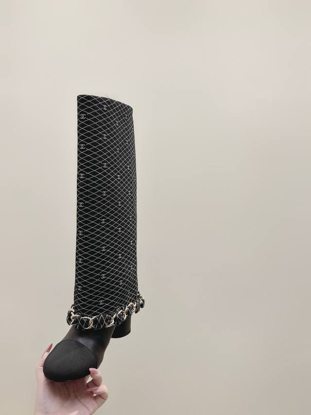 代购级 Chanel 25B New Arrival~小香25秋冬高靴新品 大链条穿皮的亮点,一眼小香! 看似有点夸张,但搭配高高宽宽的靴筒,实则协调大气的呢! 小牛皮的质感贼好,软软糯糯,脚感超赞的! 鞋面:小牛皮 内里:牛皮 跟高:4.5Cm 大底:原版真皮底 Size:35-39 40.41定做不退换