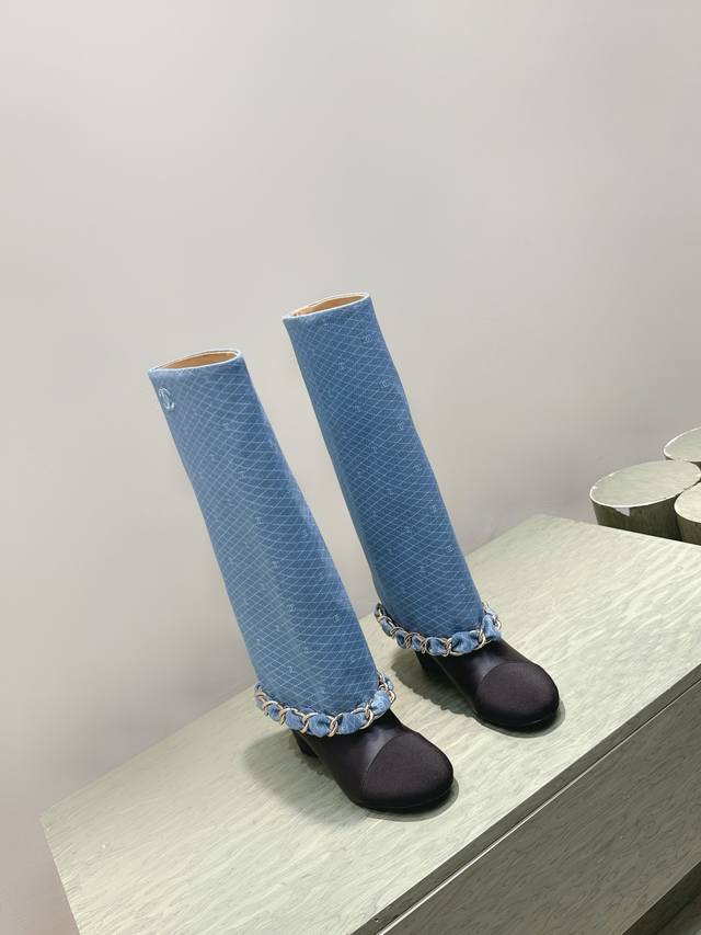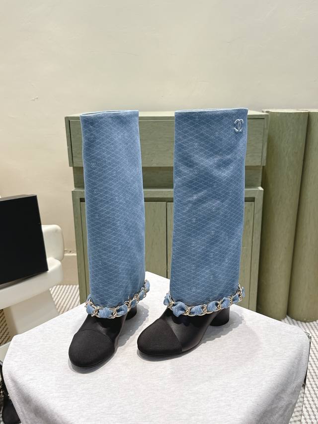 代购级 Chanel 25B New Arrival~小香25秋冬高靴新品 大链条穿皮的亮点,一眼小香! 看似有点夸张,但搭配高高宽宽的靴筒,实则协调大气的呢! 小牛皮的质感贼好,软软糯糯,脚感超赞的! 鞋面:小牛皮 内里:牛皮 跟高:4.5Cm 大底:原版真皮底 Size:35-39 40.41定做不退换