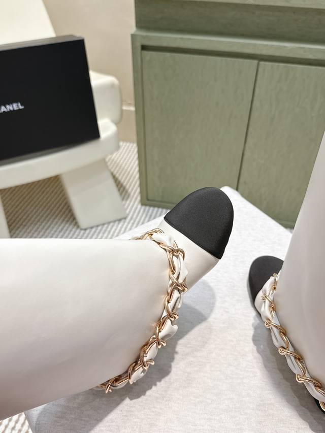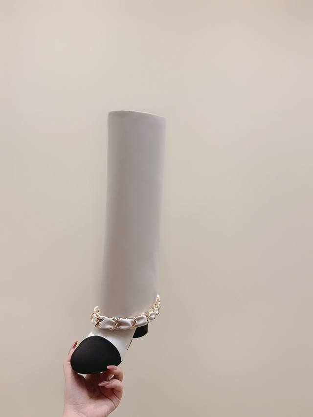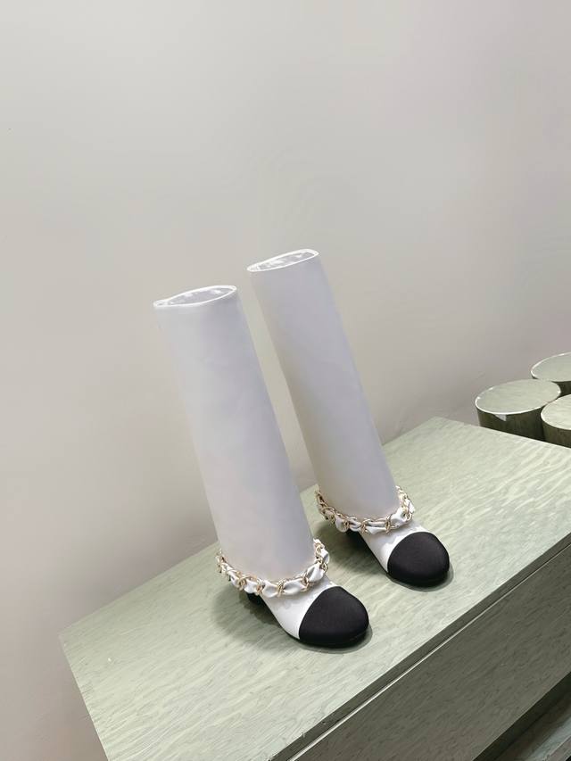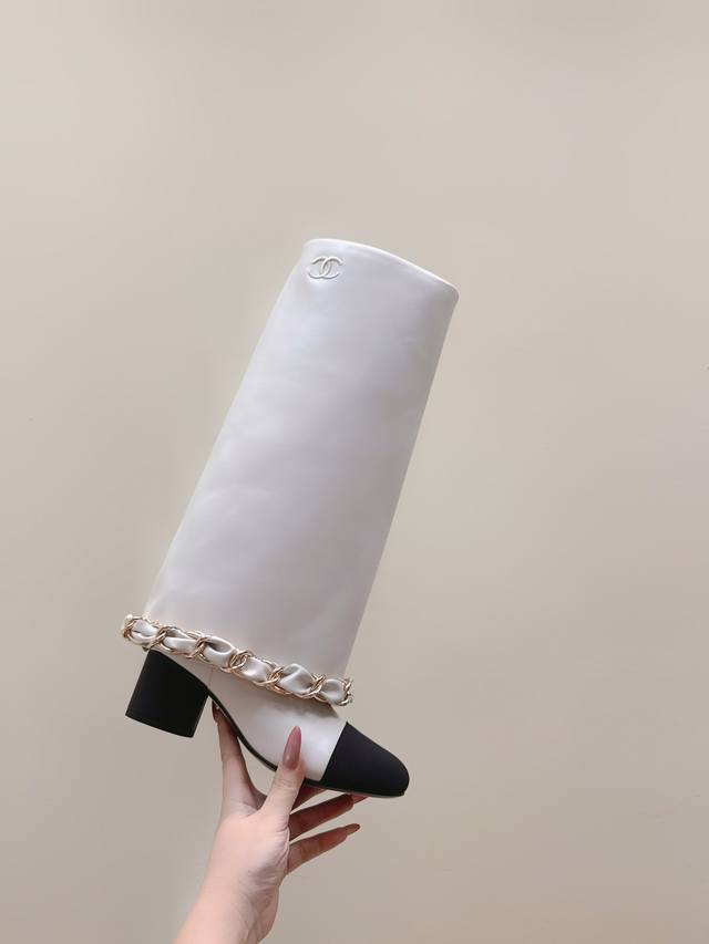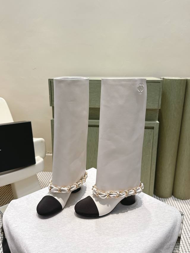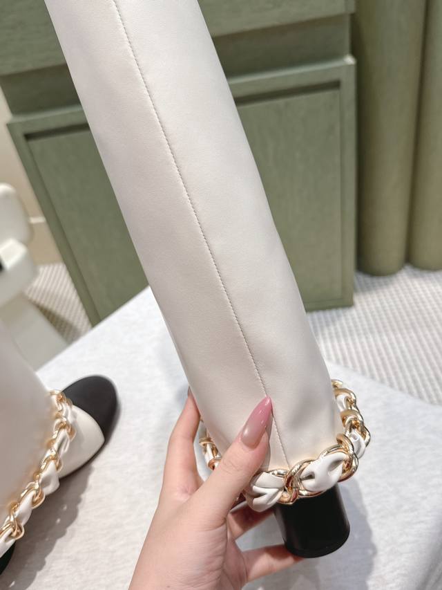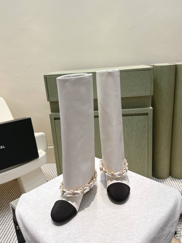 代购级 Chanel 25B New Arrival~小香25秋冬高靴新品 大链条穿皮的亮点,一眼小香! 看似有点夸张,但搭配高高宽宽的靴筒,实则协调大气的呢! 小牛皮的质感贼好,软软糯糯,脚感超赞的! 鞋面:小牛皮 内里:牛皮 跟高:4.5Cm 大底:原版真皮底 Size:35-39 40.41定做不退换