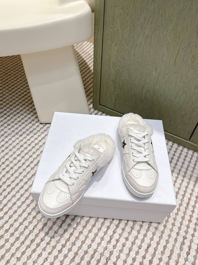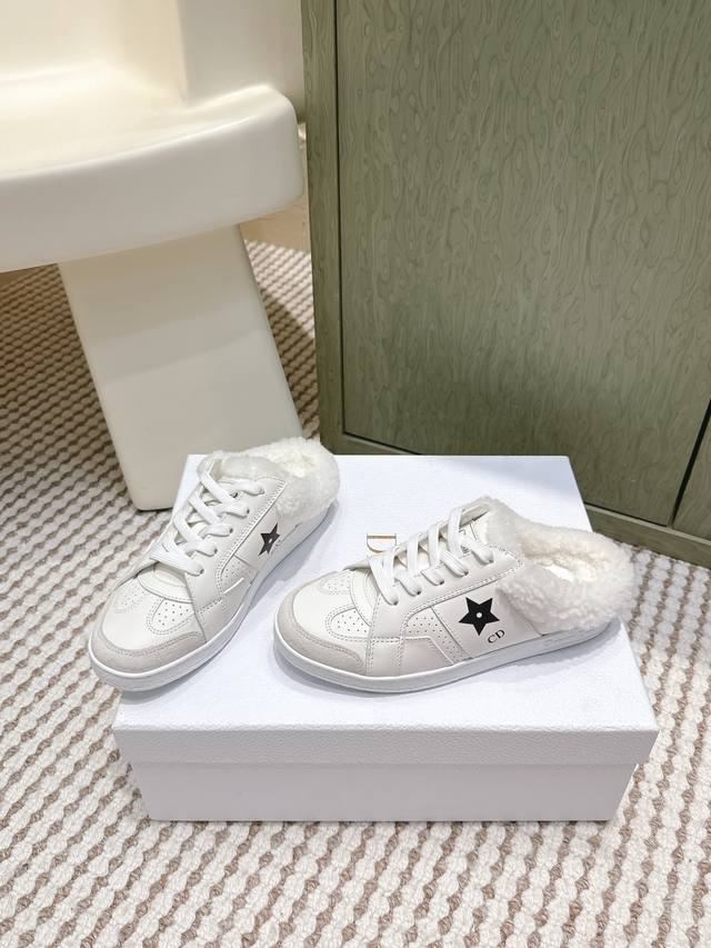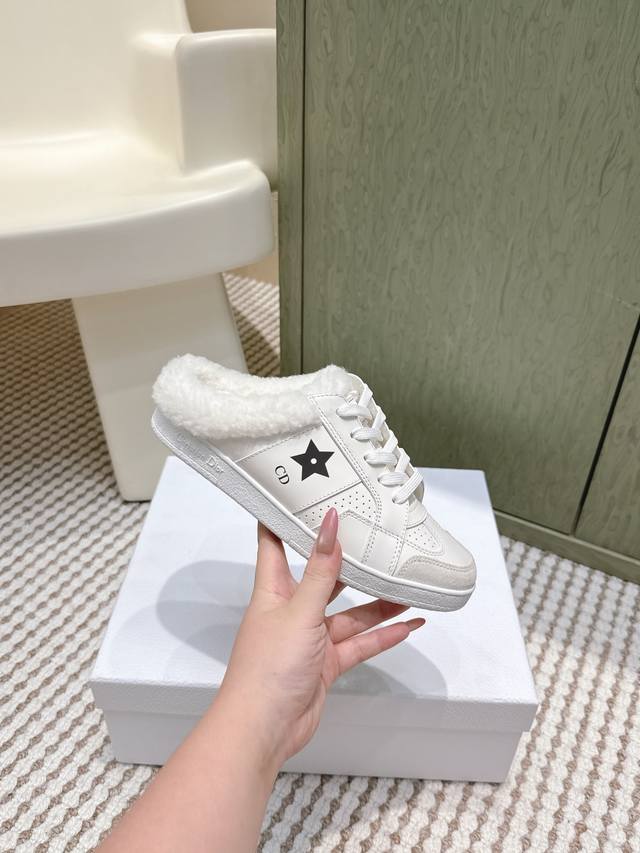 代购级 Dior 迪奥 Star 运动毛毛鞋半托鞋 这款 Dior Star 运动鞋延续经久不衰的轮廓,是新款经典单品。采用白色牛皮革精心制作,饰以同色调绒面牛皮革镶片。点缀以 Cd 和 Christian Dior Paris 标志,金属覆层星星装饰一个鞋带孔眼,提升格调。款式轻盈,搭配 Christian Dior 标志轻薄鞋底,四季皆宜,可与各式休闲造型搭配,增添点睛之笔。 Size :35-39 40.41定做