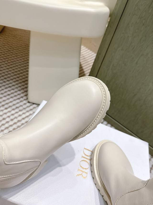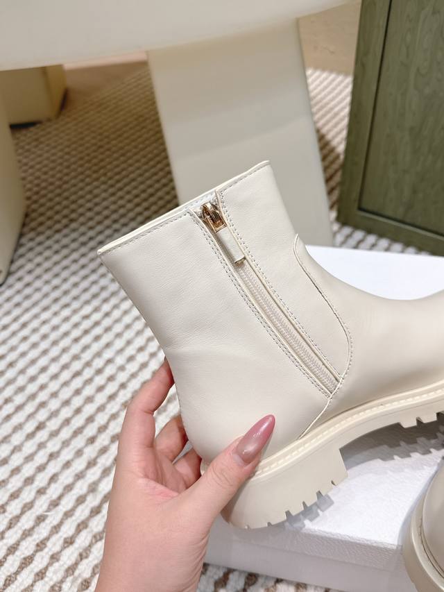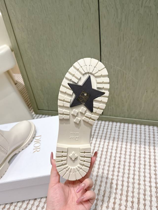 代购级 Dior 迪奥Alps D-Quest 及踝靴 这款 D-Quest 及踝靴是 Dioralps 限定系列的新品,融入 Dior 的高订风格经典标识,重新诠释经典的机车靴。采用黑色粒面牛皮革精心制作,搭配白色羊皮革皮毛一体效果内部提升格调,舒适非凡。装饰性饰带点缀以金色饰面金属 Christian Dior Paris 标志。厚实而轻盈的凹口鞋底更显休闲优雅。 主体:牛皮革 里料:羊皮革皮毛一体效果 装饰性饰带点缀以金色饰面金属 Christian Dior Paris 标志 凹口橡胶鞋底饰以 C