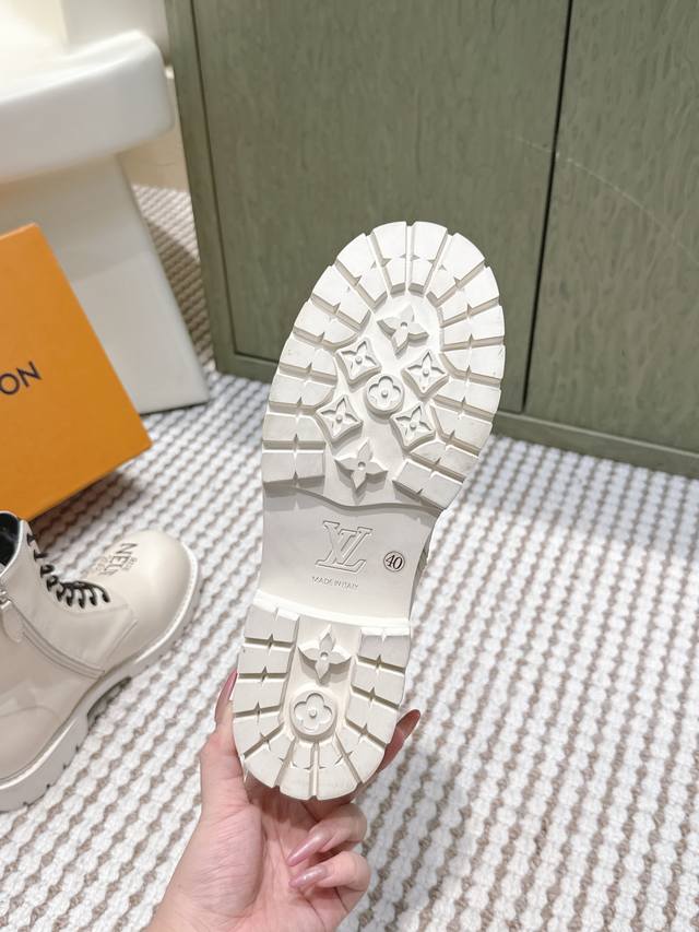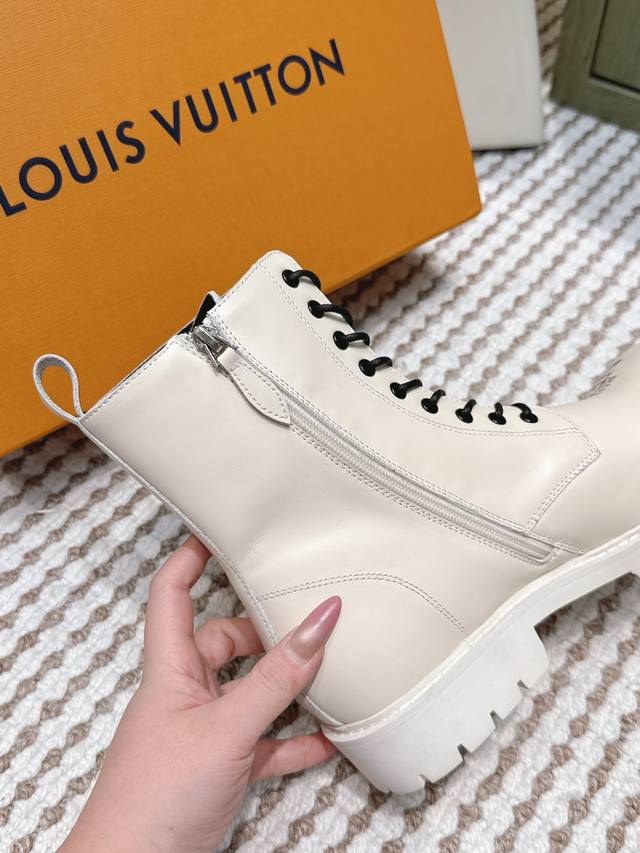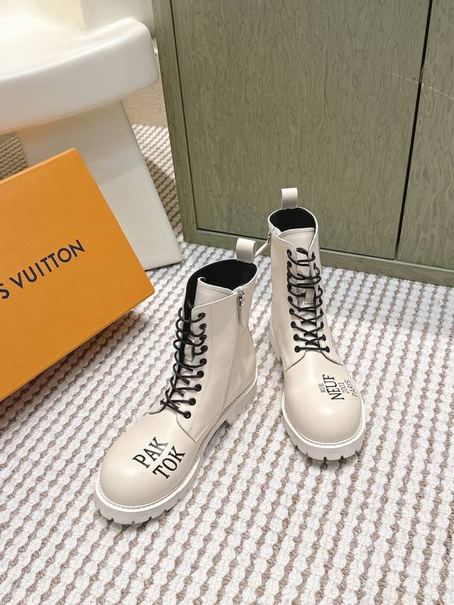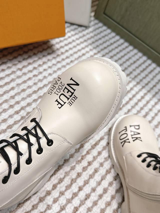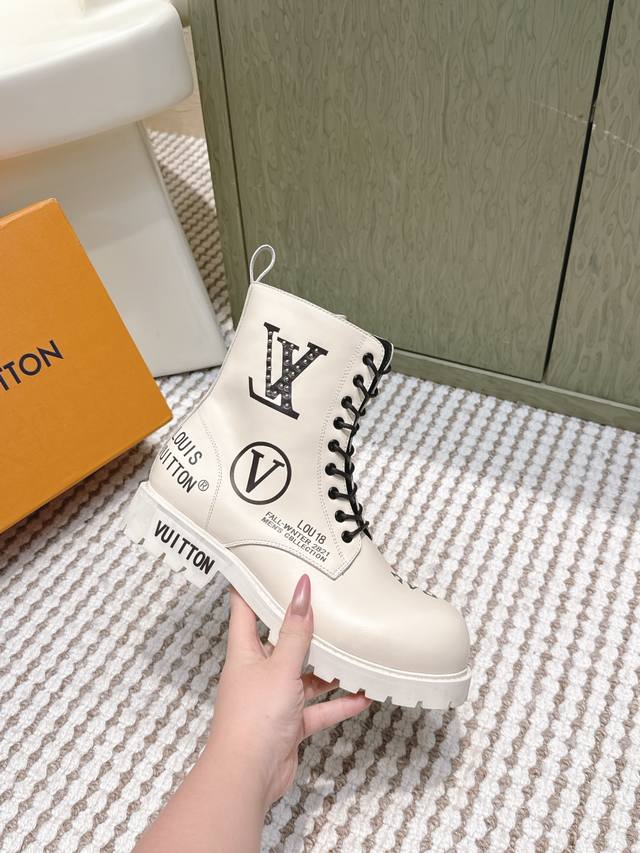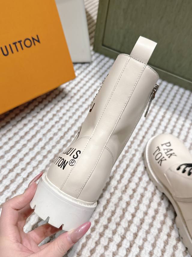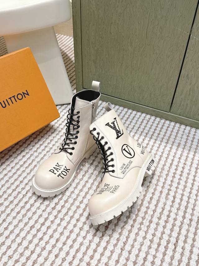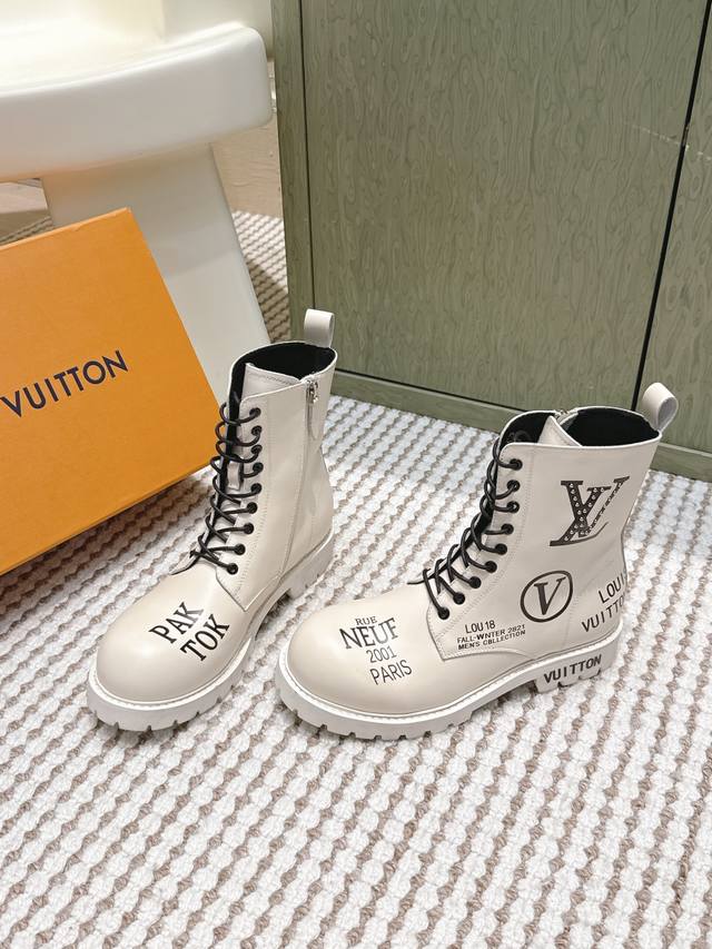 / 代购级 Louis Vuitton 涂鸦系列情侣装侧拉链系带厚底靴 本款涂鸦铆钉承载军旅灵感和的旅行传承,为舒软牛皮革鞋面点缀金属链条和Monogram帆布制成