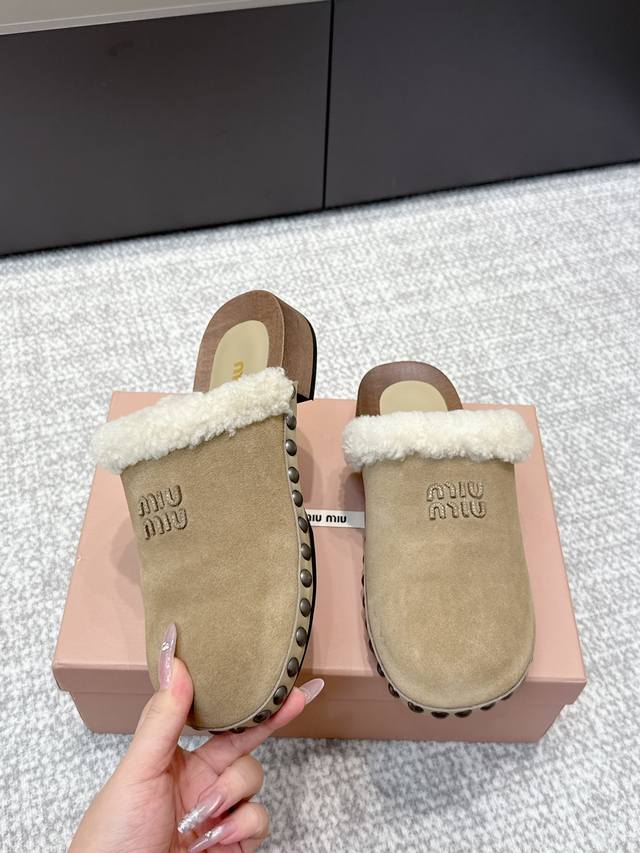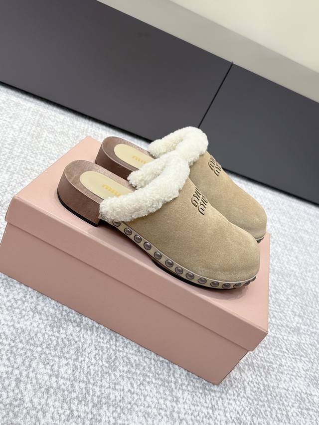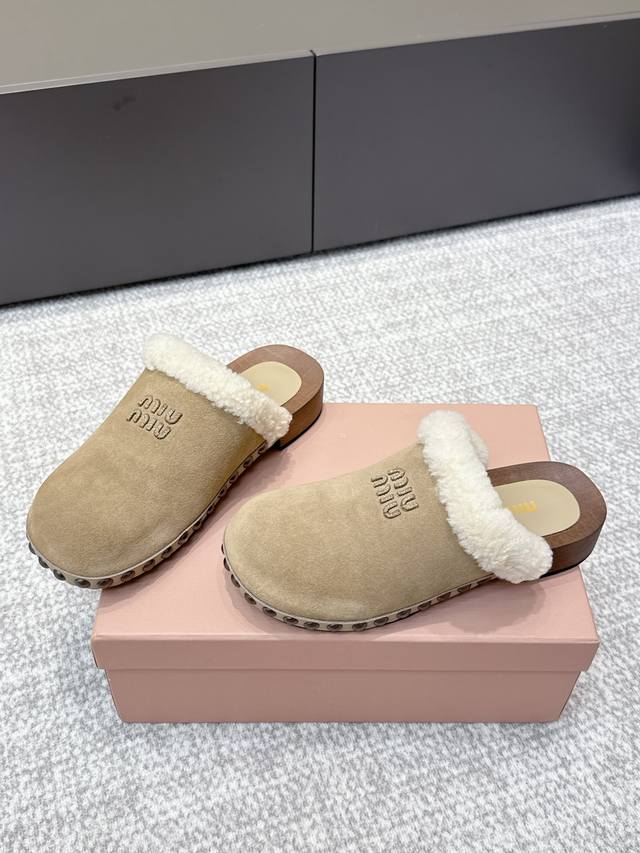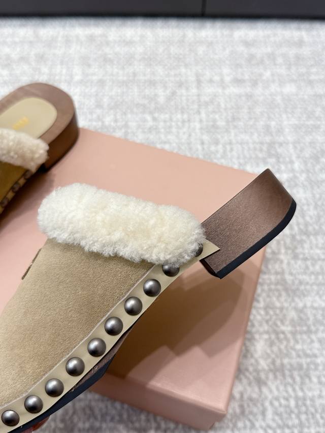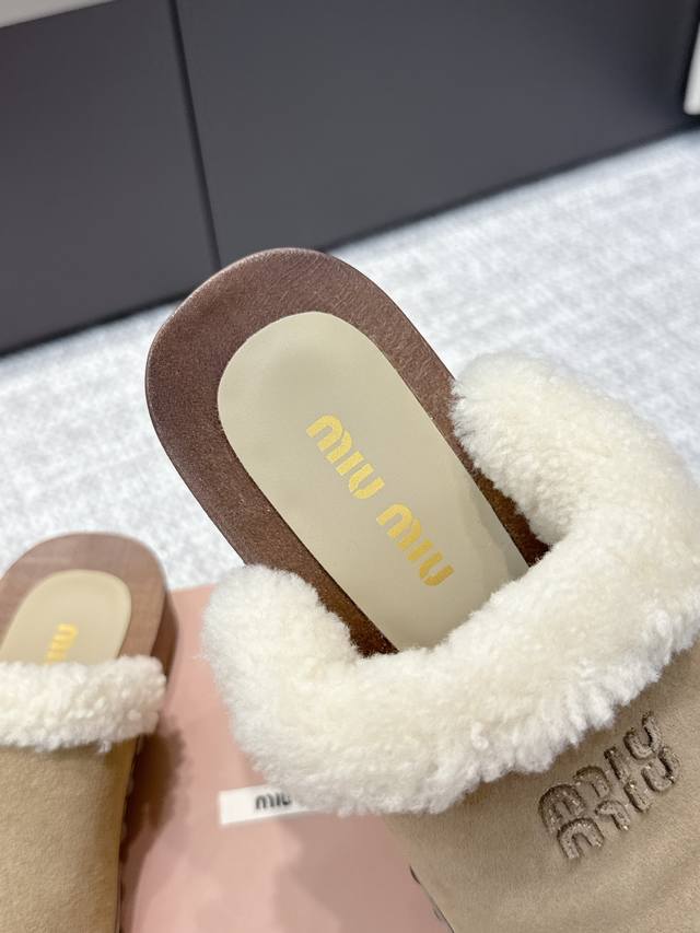 代购级 Miu Miu 25Ss秋冬新款 羊毛拖鞋 鞋Miumiu秀场适当独一无二的擦色工艺工艺来自Miu Miu系列的细节特写 新季的潮流要素一此刻挚爱的概念