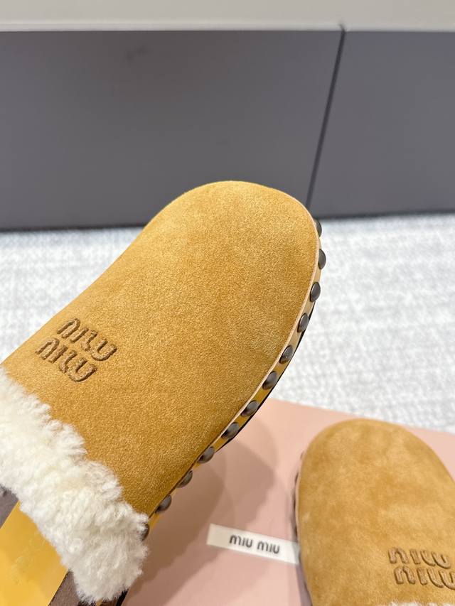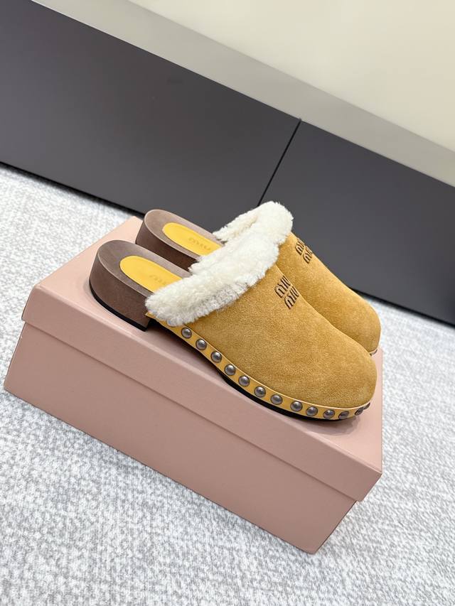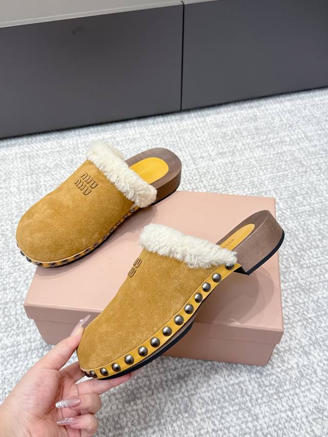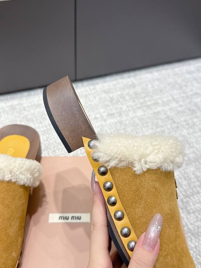 代购级 Miu Miu 25Ss秋冬新款 羊毛拖鞋 鞋Miumiu秀场适当独一无二的擦色工艺工艺来自Miu Miu系列的细节特写 新季的潮流要素一此刻挚爱的概念
