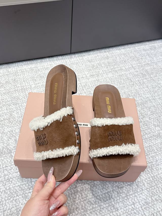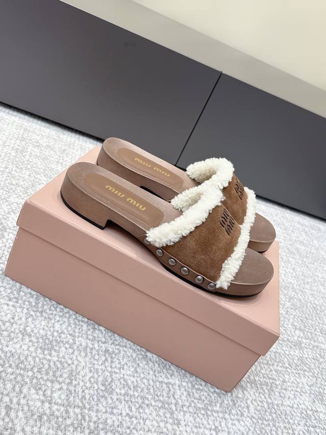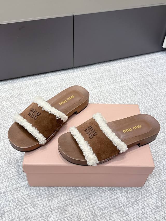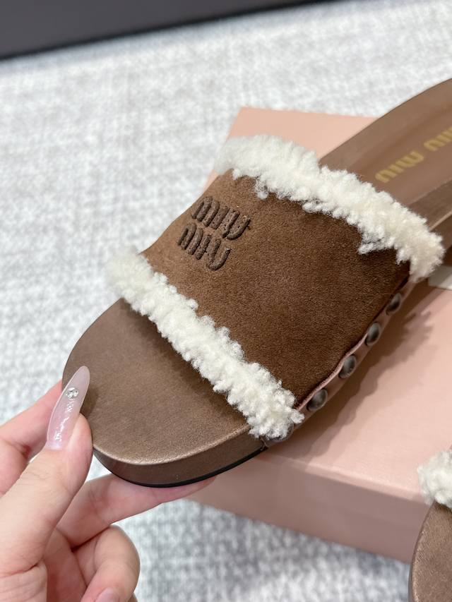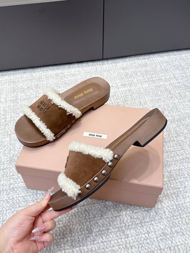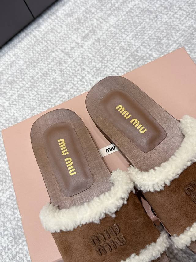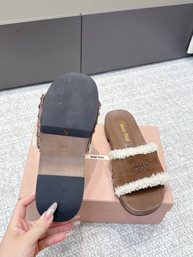 代购级 Miu Miu 25Ss秋冬新款 羊毛拖鞋 鞋Miumiu秀场适当独一无二的擦色工艺工艺来自Miu Miu系列的细节特写 新季的潮流要素一此刻挚爱的概念,多元对撞,传达现代风格~怎么穿都好看今夏时髦精最爱 看起来不怎么舒服 上脚超级舒服 面料:进口羊毛磨砂 内里:进口羊毛 颗粒毛 大底:原版实物鞋底 非普通鞋底 Size:35-41 40 41订做不退换