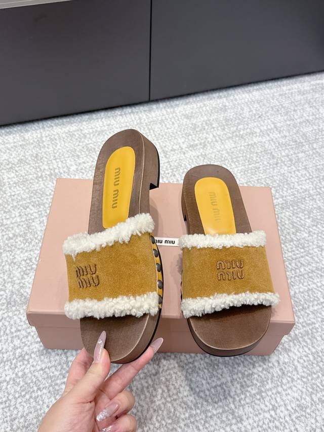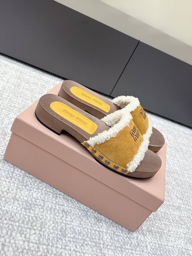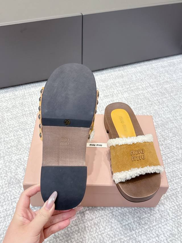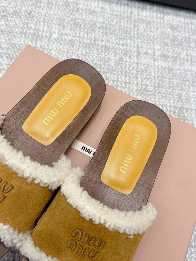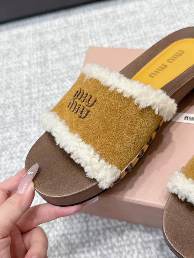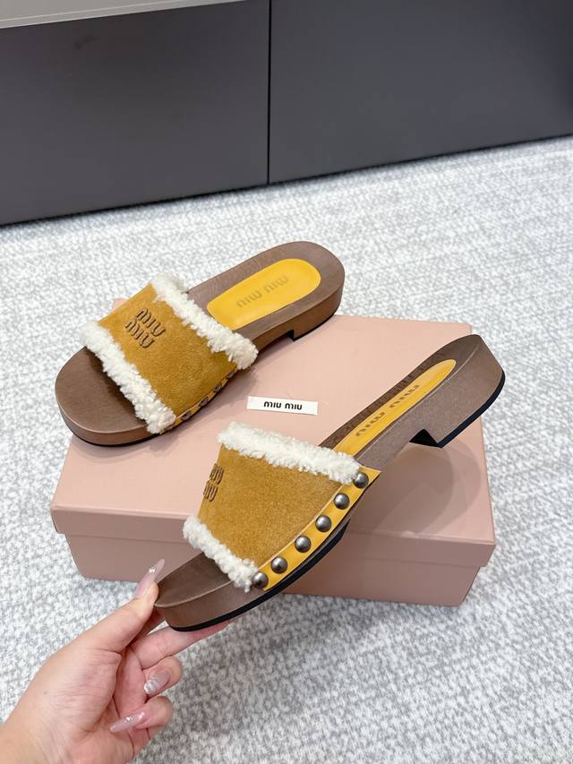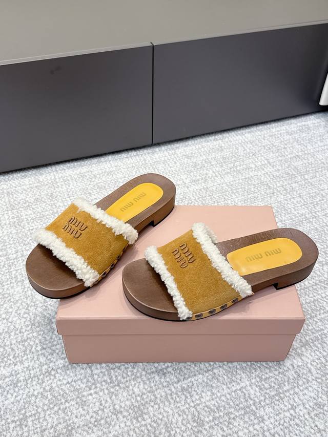 代购级 Miu Miu 25Ss秋冬新款 羊毛拖鞋 鞋Miumiu秀场适当独一无二的擦色工艺工艺来自Miu Miu系列的细节特写 新季的潮流要素一此刻挚爱的概念