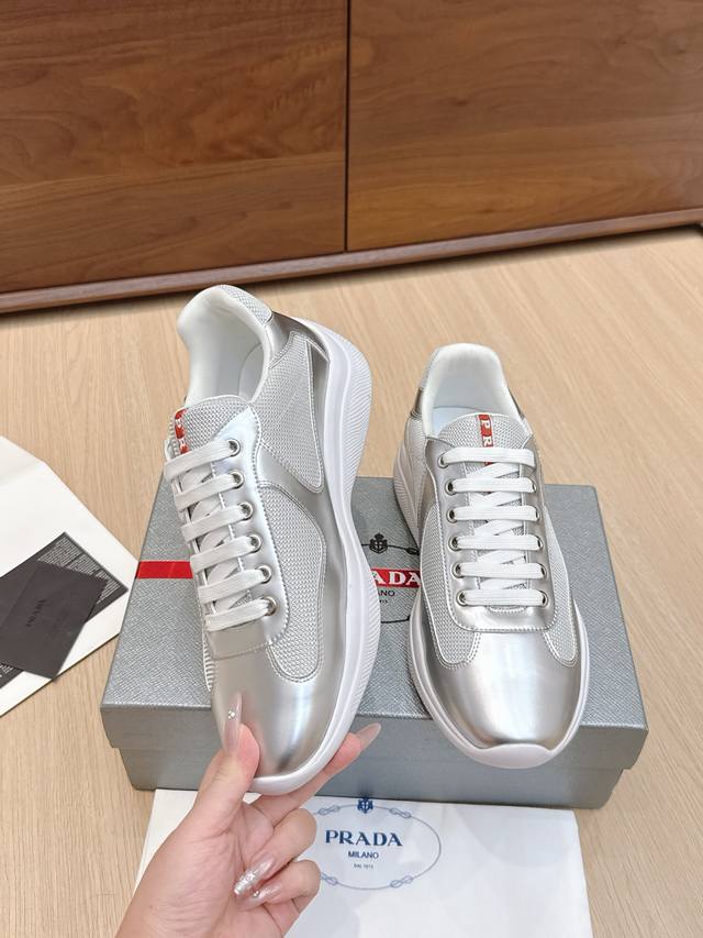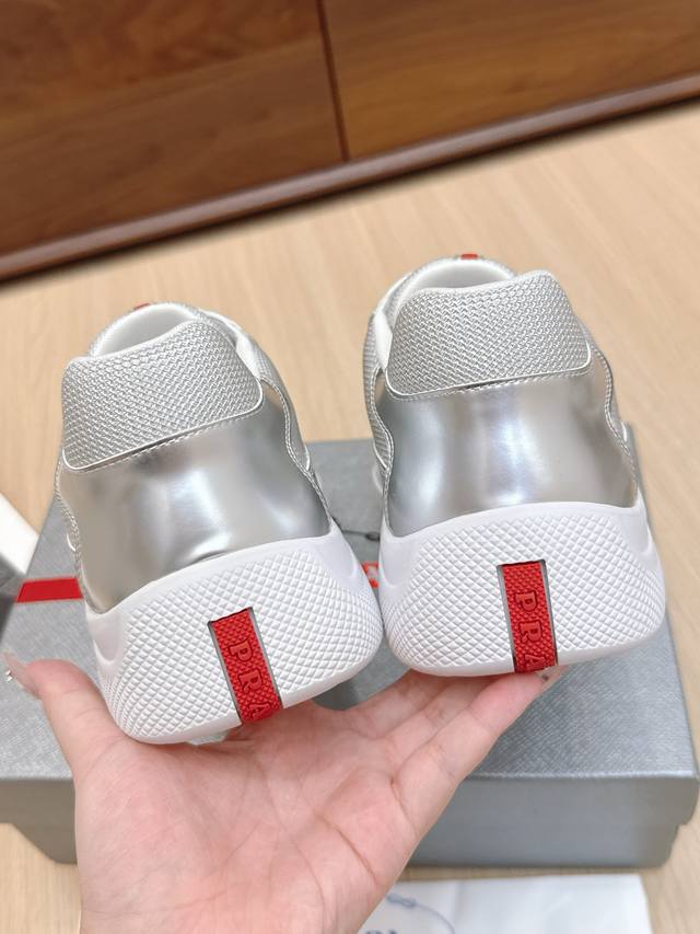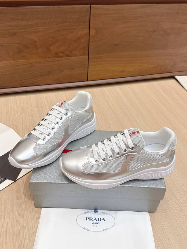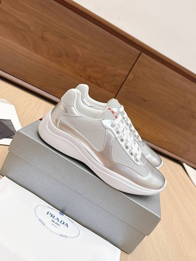 代购级 Prada普拉达America’S Cup系列 漆皮 网面 休闲 运动鞋 原版购入开发 做货 这款漆面皮革运动鞋内嵌Bike织物,灵感源自经典美学理念。 鞋舌和鞋底饰以富有辨识度的Prada Linea Rossa标识,进一步提升格调 配送专柜精美包装 面料: 原版定制进口头层牛皮 内里: 原版进口透气网里 大底: 原版开模防滑Tpu材质 底厚: 4Cm Size: 男款38-46 38 45 46定做