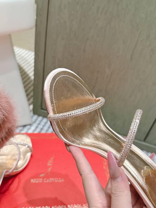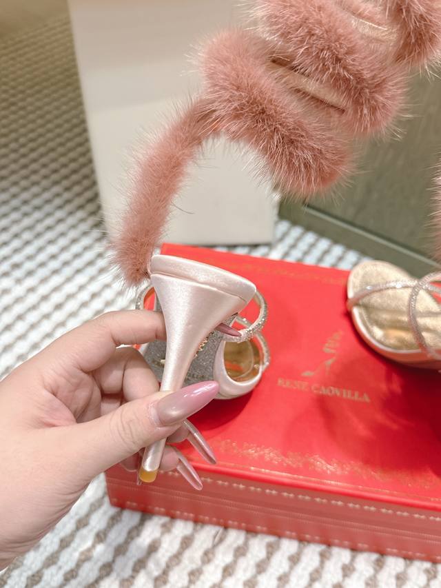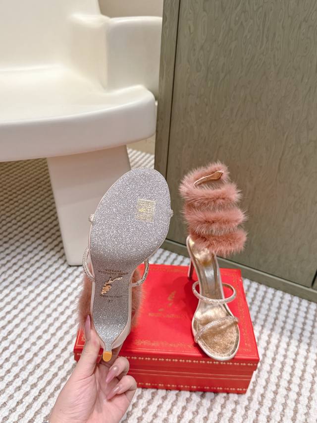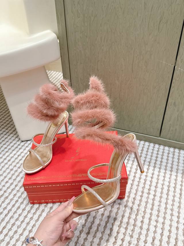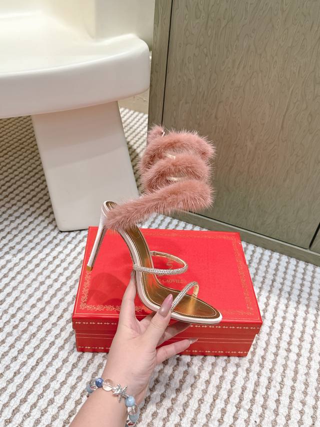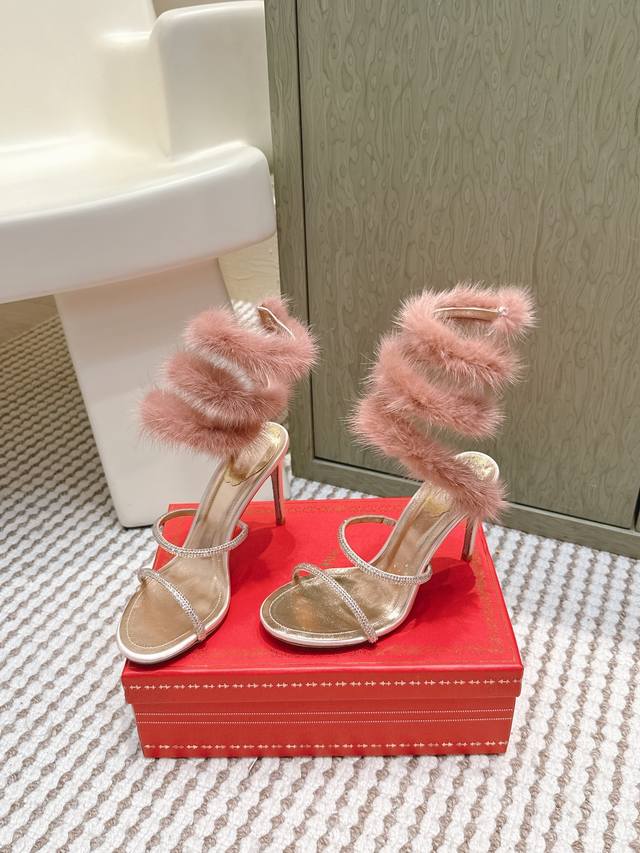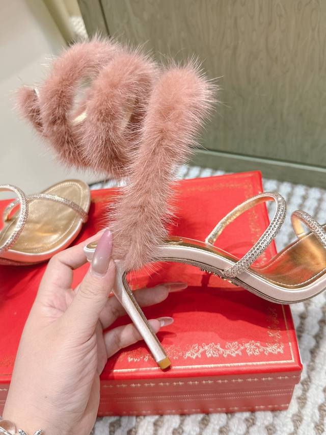 代购级 Rene Caovilla经典的蛇形绊带缠绕兔毛毛高跟凉鞋 凸现优美腿型 见证你的璀璨高光时刻 ,经典蛇形造型和飘逸软兔毛相结合 ,皮草缀饰细高跟凉鞋新