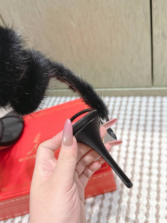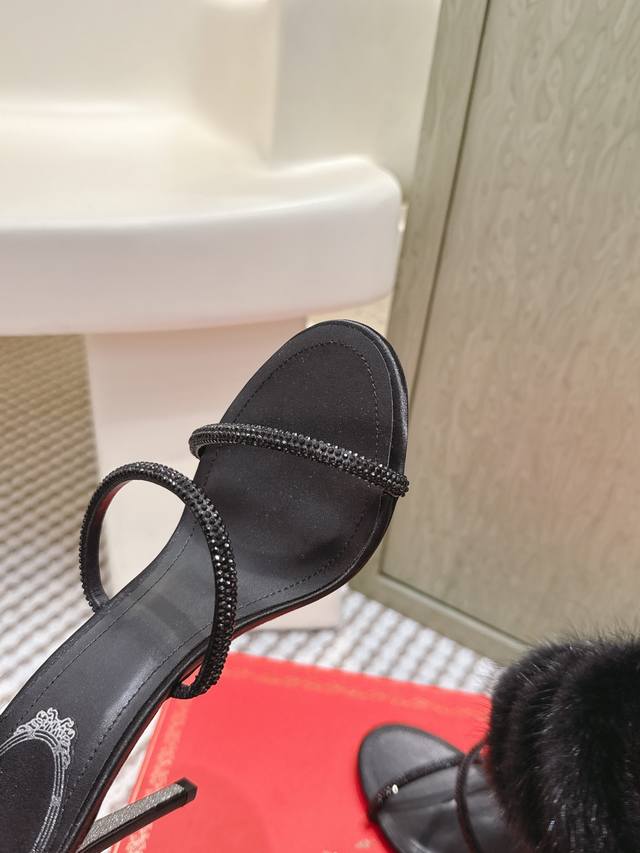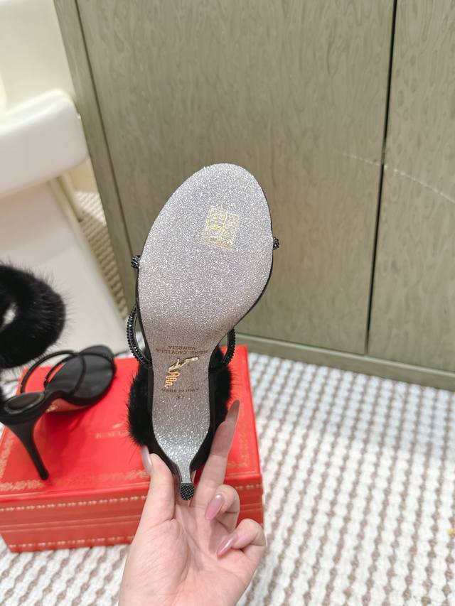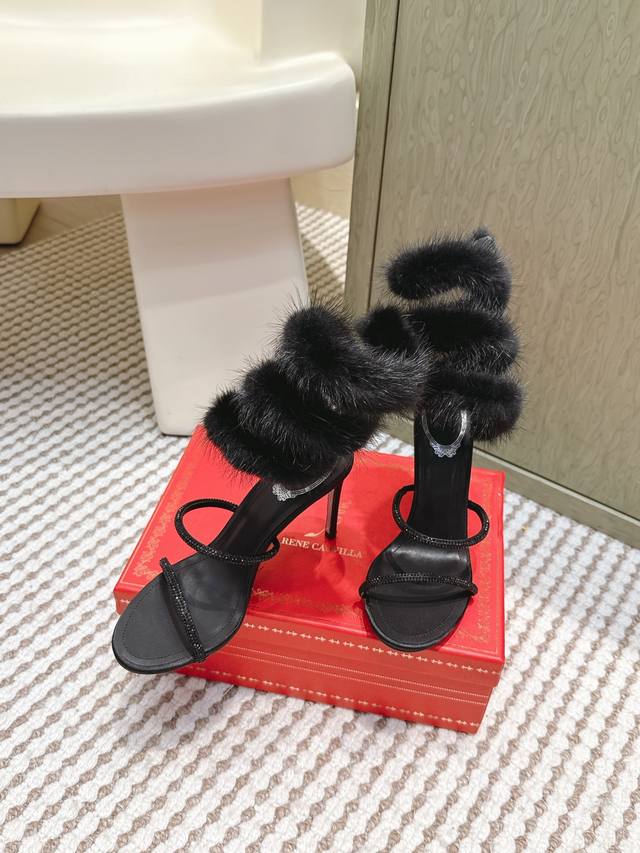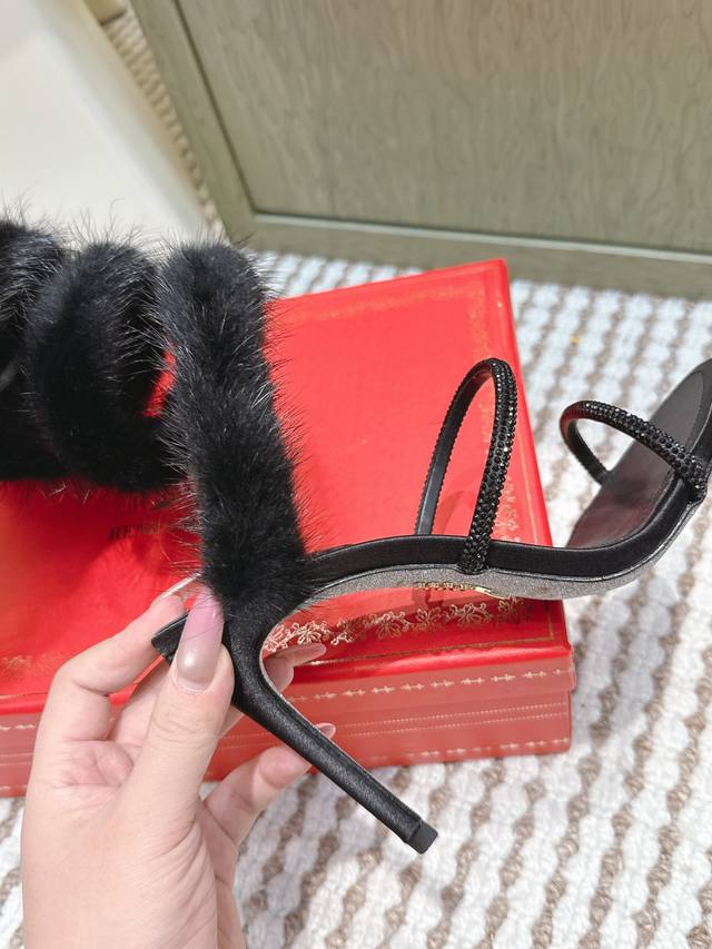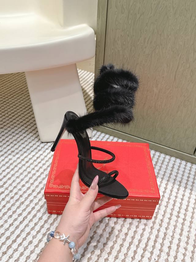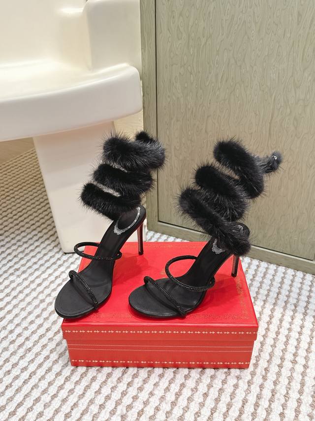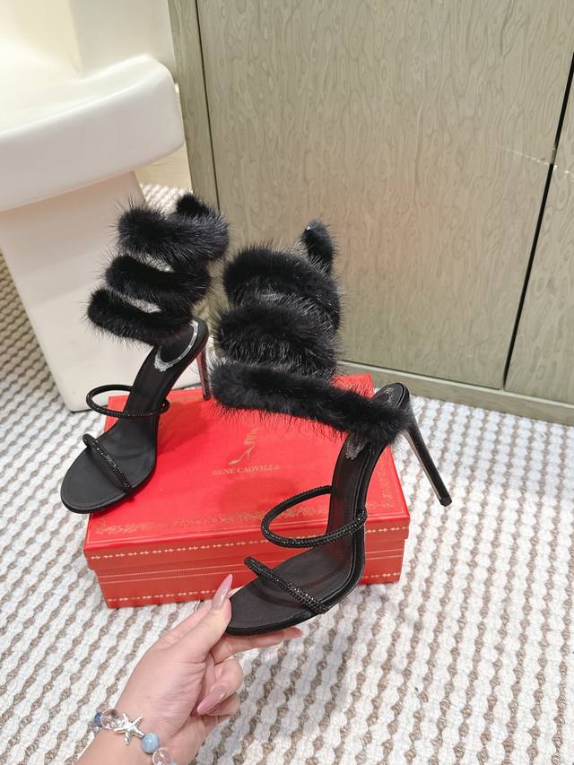 / 代购级 Rene Caovilla经典的蛇形绊带缠绕兔毛毛高跟凉鞋 凸现优美腿型 见证你的璀璨高光时刻 ,经典蛇形造型和飘逸软兔毛相结合 ,皮草缀饰细高跟凉鞋新