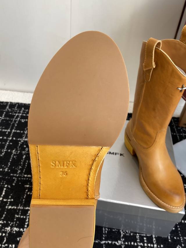 代购级 Smfk十字架新款 含金量谁懂 牛仔靴 短靴秋天里的一抹黄,其实它很帅升级版的 这双短靴是很有质感的油蜡黄色 配合马皮面料制作而成 大底使用固特异工艺进
