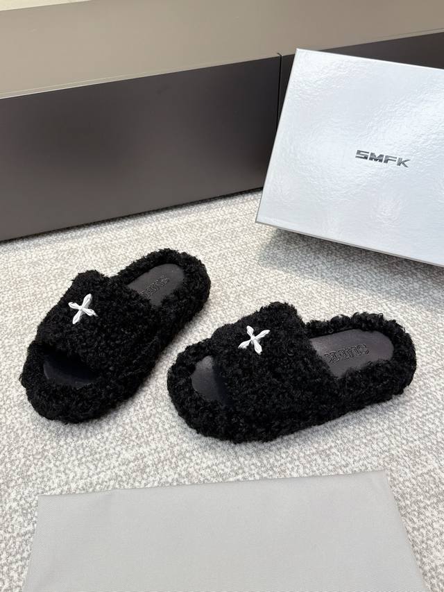 / 代购级 Smfk厚底面包拖鞋,超级火的一款面包拖,被种草得不行 各大网红博主都在穿它,巧妙纳入品牌元素后时尚百搭、辣妹至爱,被完美释放 面料:羊毛 内里 垫脚合