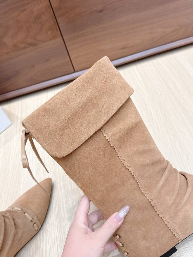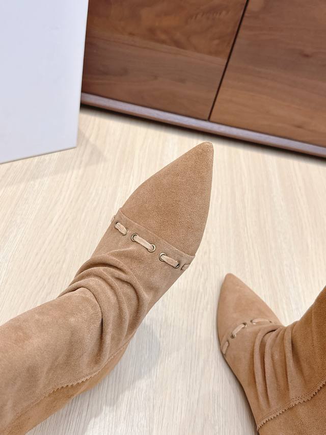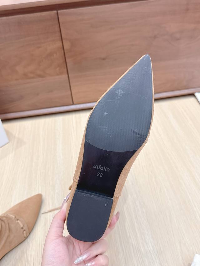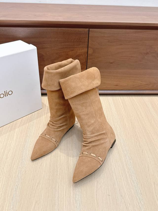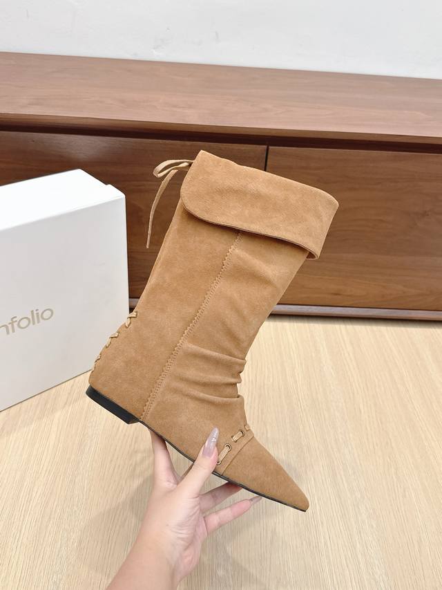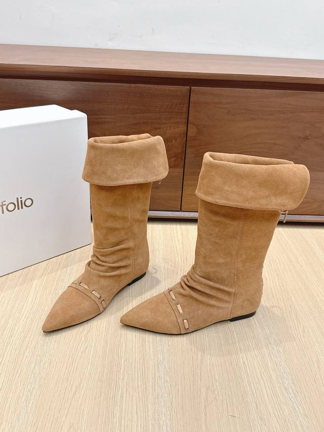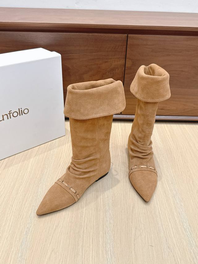代购级 Unfolio 小众品牌秋冬新款堆堆靴时髦复古长靴堆叠感及膝靴踝靴 Sienna 堆叠感踝靴,黑色甄选小牛皮,皮质光滑细腻,纹理自然流畅,触感紧实且富有光泽,呈现低调优雅的质感;反毛牛皮款则自带慵懒随性气质,绒面触感柔和温润,随穿着愈发贴合足部,尽显松弛自在的风格。 内里均采用高弹织物材质,春夏季节穿着不闷脚,秋冬包裹感拉满,兼具保暖性与舒适亲肤性。特别加入3Cm 隐形内增高设计,增高不突兀,既修饰腿部线条,又避免普通增高鞋的笨重感,久穿不累。 鞋底选用超软橡胶材质,柔韧度优异,能随步伐灵活弯曲,