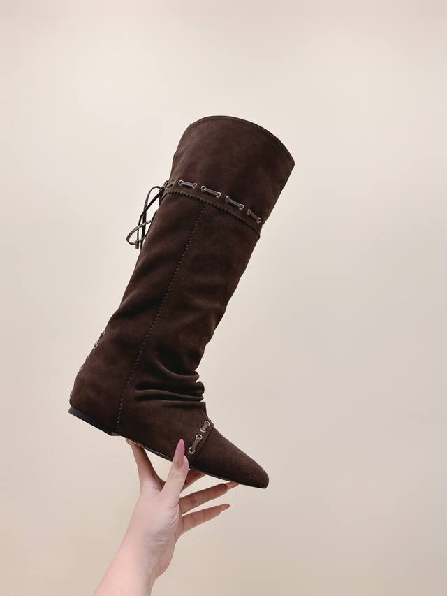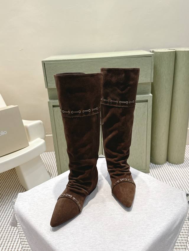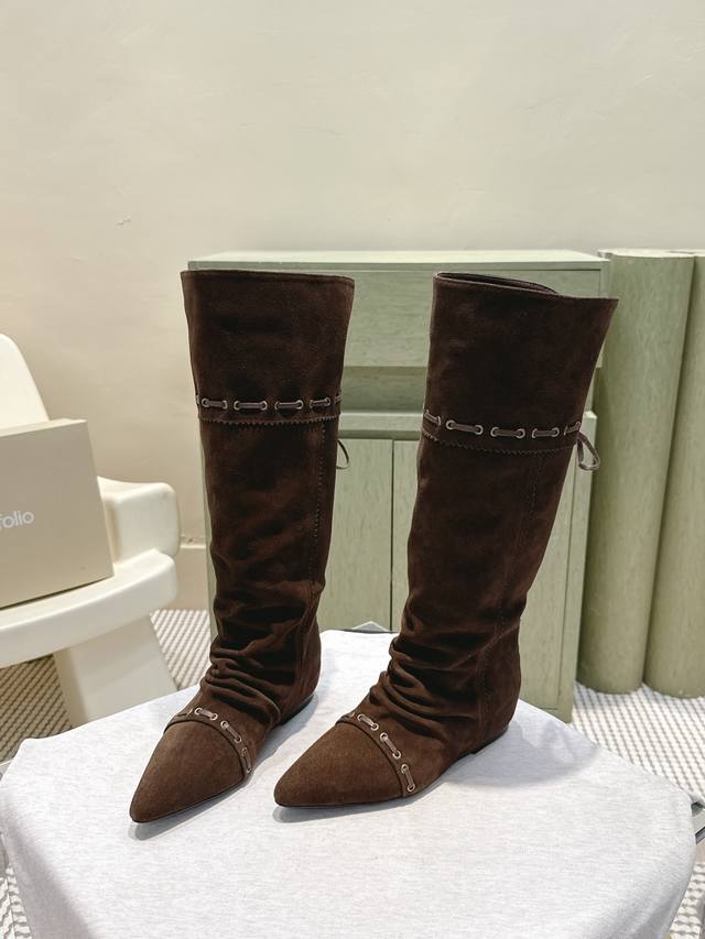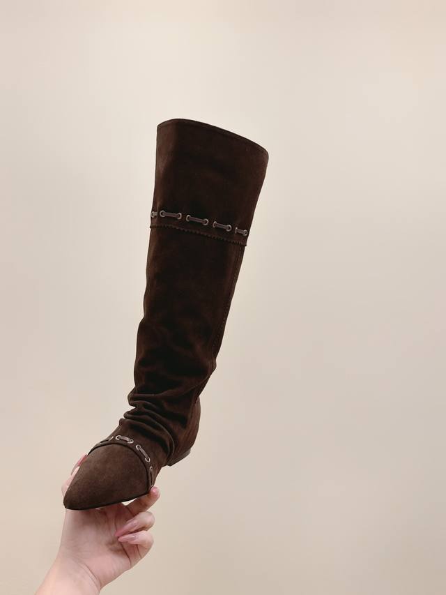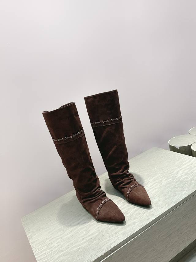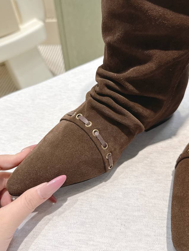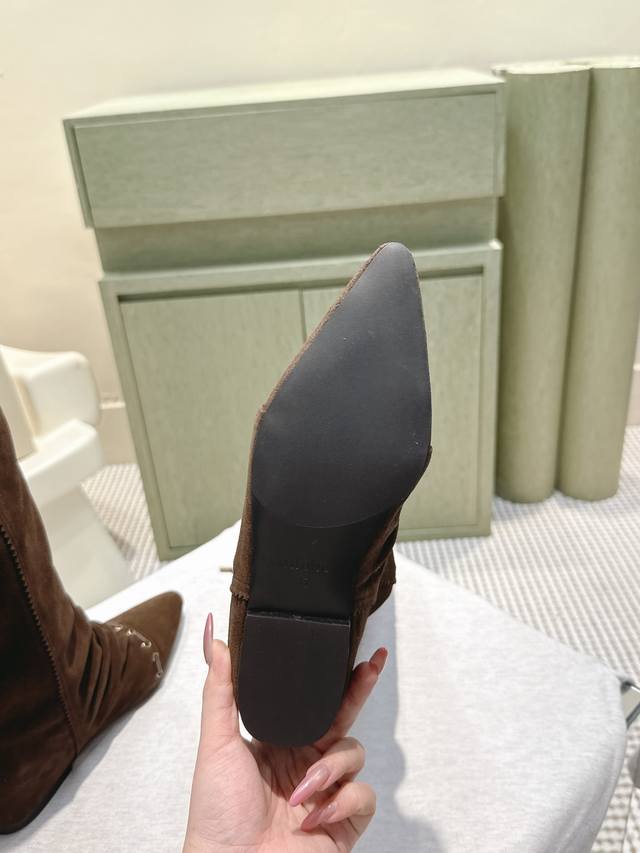 代购级 Unfolio 小众品牌秋冬新款堆堆靴时髦复古长靴堆叠感及膝靴踝靴 Sienna 堆叠感踝靴,黑色甄选小牛皮,皮质光滑细腻,纹理自然流畅,触感紧实且富有光泽,呈现低调优雅的质感;反毛牛皮款则自带慵懒随性气质,绒面触感柔和温润,随穿着愈发贴合足部,尽显松弛自在的风格。 内里均采用高弹织物材质,春夏季节穿着不闷脚,秋冬包裹感拉满,兼具保暖性与舒适亲肤性。特别加入3Cm 隐形内增高设计,增高不突兀,既修饰腿部线条,又避免普通增高鞋的笨重感,久穿不累。 鞋底选用超软橡胶材质,柔韧度优异,能随步伐灵活弯曲,