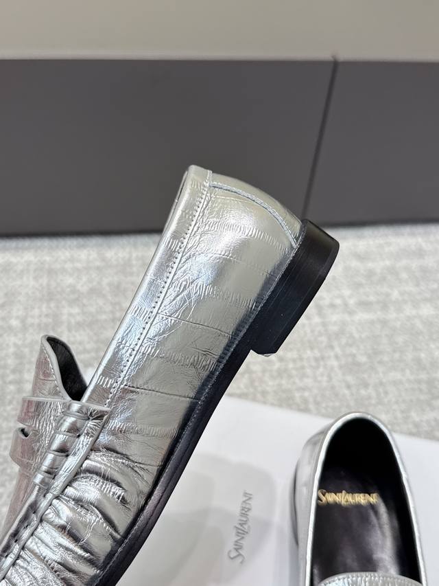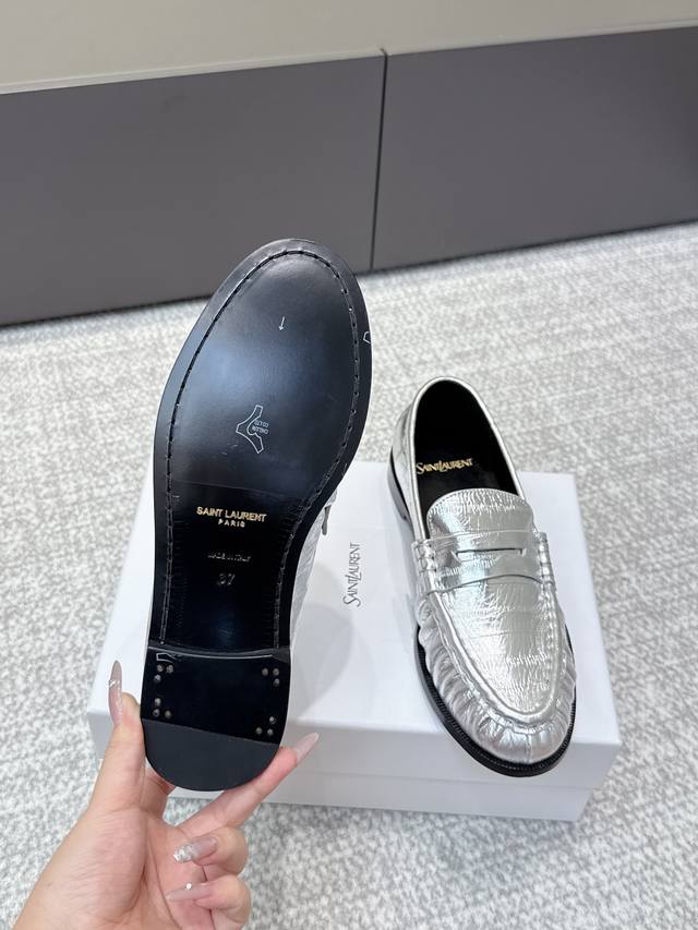 代购级 Yves Saint Laurent 25Ss新品Ysl小Logo乐福鞋 标志性的小Logo是这双鞋的灵魂所在 以低调而精致的姿态呈现于鞋身之上。 不同于张扬的大标识 它安静却醒目 用简洁线条勾勒出Ysl独有的时尚Dna 在不经意间透露出品牌的深厚底蕴 鞋头的经典杏仁形设计 巧妙修饰脚型 在视觉上拉长足部线条 彰显优雅与秀气 。 无论是搭配简约阔腿裤 还是俏皮小短裙 都能轻松驾驭 展现不同风格魅力 成为造型中的点睛之笔。 面料:采用原版定制皮料 内里:垫脚均为羊皮 鞋底:意大利进口真皮大底 Siz