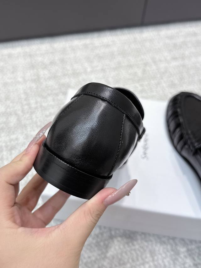 代购级 Yves Saint Laurent 25Ss新品Ysl小Logo乐福鞋 标志性的小Logo是这双鞋的灵魂所在 以低调而精致的姿态呈现于鞋身之上。 不同于张扬的大标识 它安静却醒目 用简洁线条勾勒出Ysl独有的时尚Dna 在不经意间透露出品牌的深厚底蕴 鞋头的经典杏仁形设计 巧妙修饰脚型 在视觉上拉长足部线条 彰显优雅与秀气 。 无论是搭配简约阔腿裤 还是俏皮小短裙 都能轻松驾驭 展现不同风格魅力 成为造型中的点睛之笔。 面料:采用原版定制皮料 内里:垫脚均为羊皮 鞋底:意大利进口真皮大底 Siz