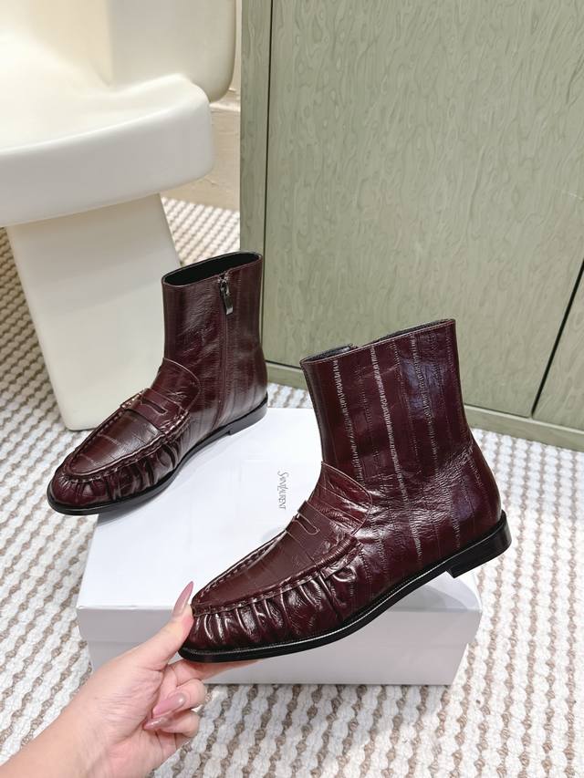 代购级 Yves Saint Laurent 25Ss新品Ysl小Logo高邦乐福鞋 标志性的小Logo是这双鞋的灵魂所在 以低调而精致的姿态呈现于鞋身之上。 不同于张扬的大标识 它安静却醒目 用简洁线条勾勒出Ysl独有的时尚Dna 在不经意间透露出品牌的深厚底蕴 鞋头的经典杏仁形设计 巧妙修饰脚型 在视觉上拉长足部线条 彰显优雅与秀气 。 无论是搭配简约阔腿裤 还是俏皮小短裙 都能轻松驾驭 展现不同风格魅力 成为造型中的点睛之笔。 面料:采用原版定制皮料 内里:垫脚均为羊皮 鞋底:意大利进口真皮大底 S