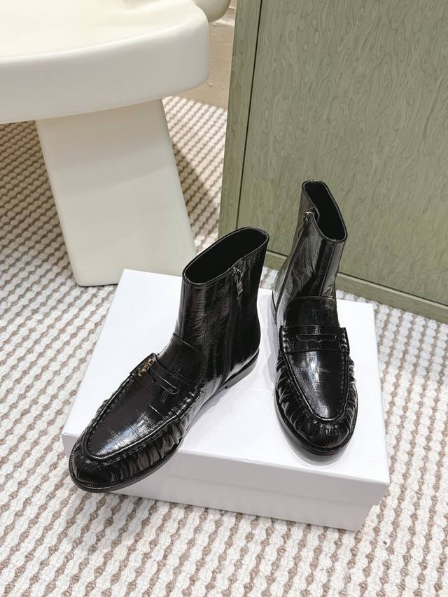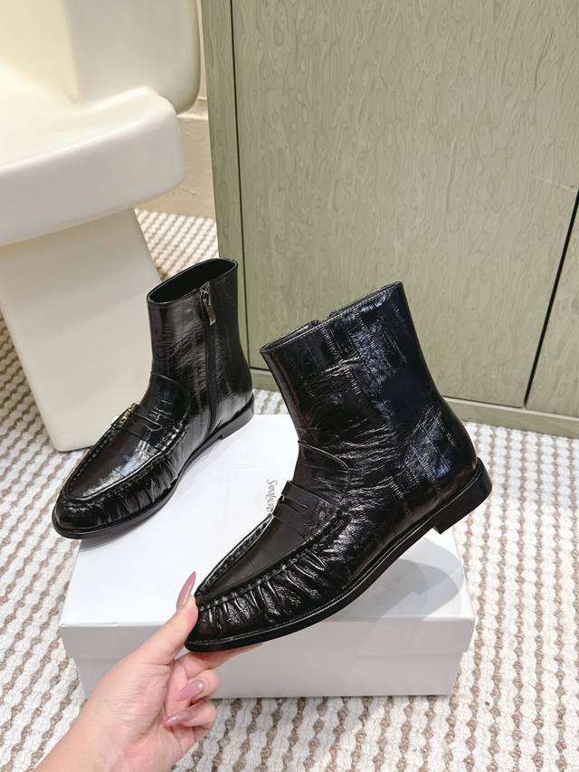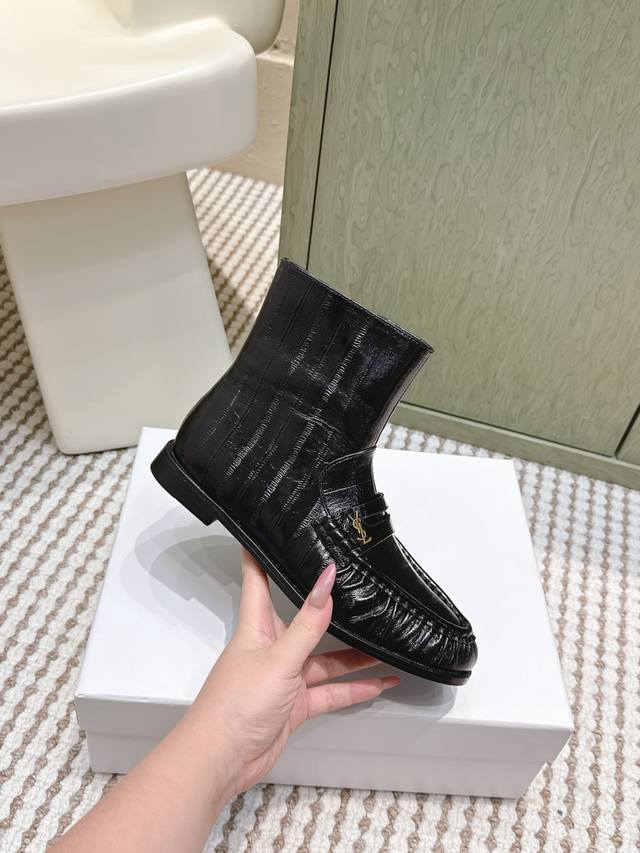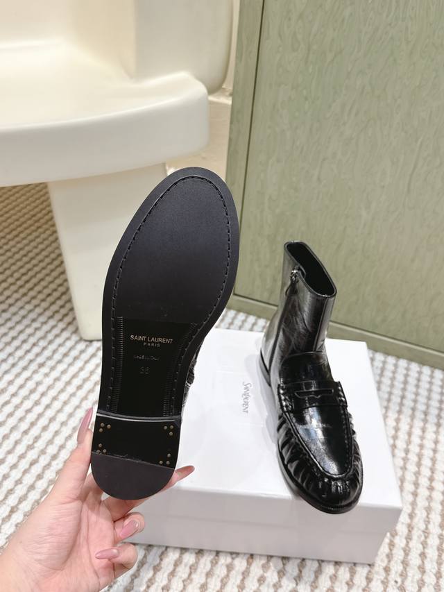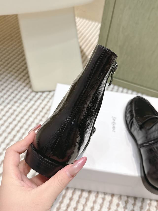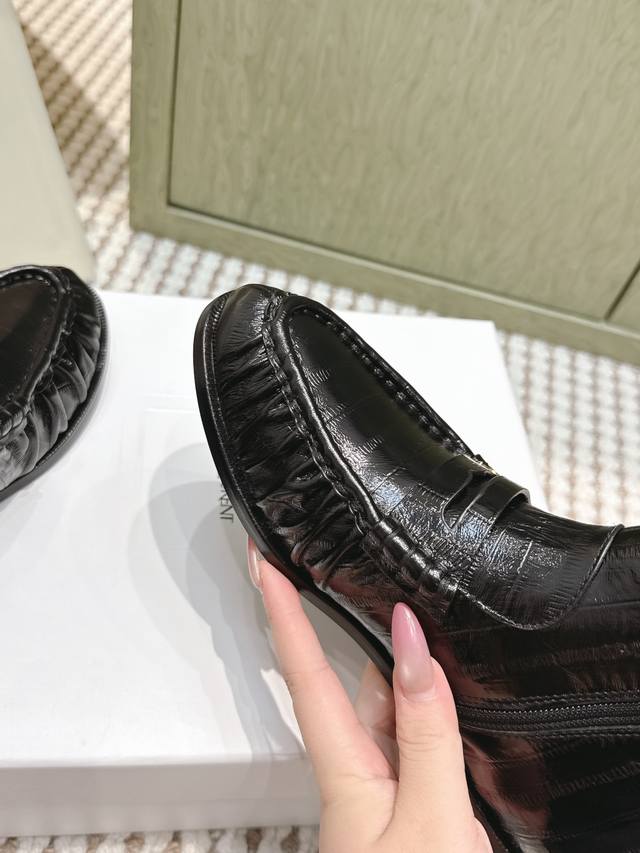 代购级 Yves Saint Laurent 25Ss新品Ysl小Logo高邦乐福鞋 标志性的小Logo是这双鞋的灵魂所在 以低调而精致的姿态呈现于鞋身之上。 不同于张扬的大标识 它安静却醒目 用简洁线条勾勒出Ysl独有的时尚Dna 在不经意间透露出品牌的深厚底蕴 鞋头的经典杏仁形设计 巧妙修饰脚型 在视觉上拉长足部线条 彰显优雅与秀气 。 无论是搭配简约阔腿裤 还是俏皮小短裙 都能轻松驾驭 展现不同风格魅力 成为造型中的点睛之笔。 面料:采用原版定制皮料 内里:垫脚均为羊皮 鞋底:意大利进口真皮大底 S