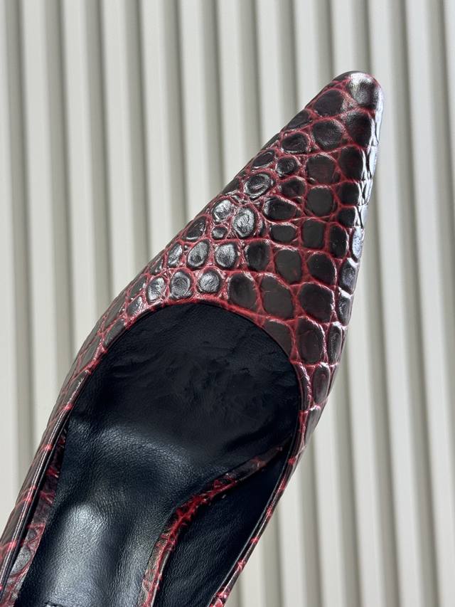 代购级Alaia阿莱2025新款粗跟尖头单鞋 鞋面:小牛皮搭配压印鳄鱼纹,更显质感 跟高:9Cm 鞋底 :意大利进口牛皮底! Size :35-41 40 41