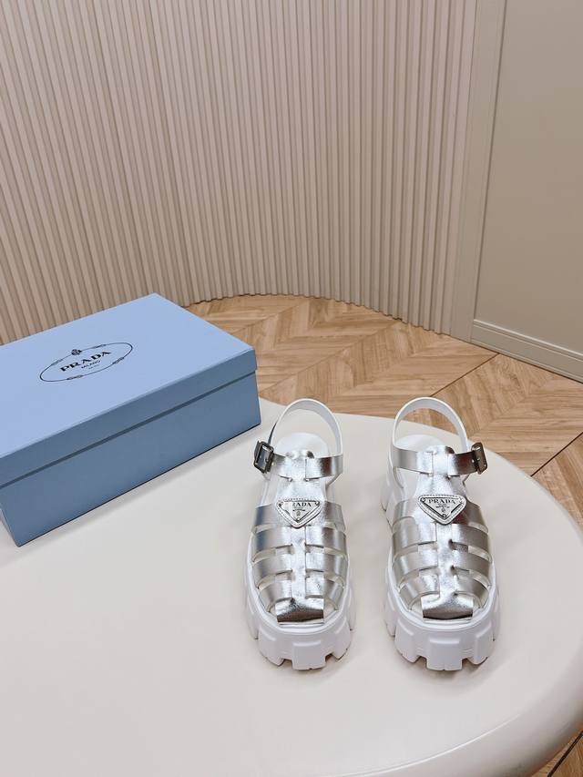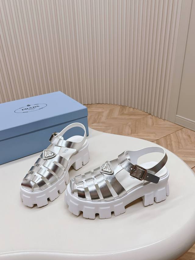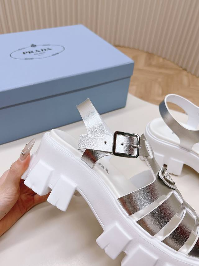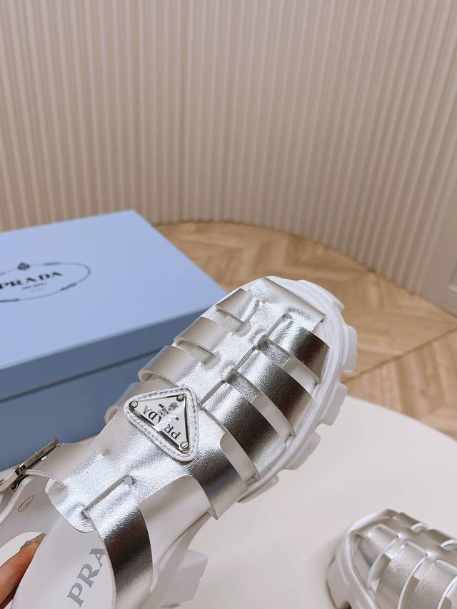 全色系升级 Prada 普拉达猪笼鞋锯齿罗马编织厚底橡胶凉鞋 复古时髦前卫的轮齿55Mm 厚底鞋底搭配橡胶鞋面,让整双鞋轻便舒适 鲜艳色彩 满足不同风格时髦人士的多种选择! 标志性金属三角标搭配古沙滩凉鞋造型,每一个设计元素都踩在时髦点上! 码数35-40