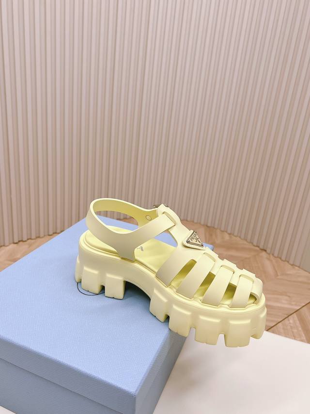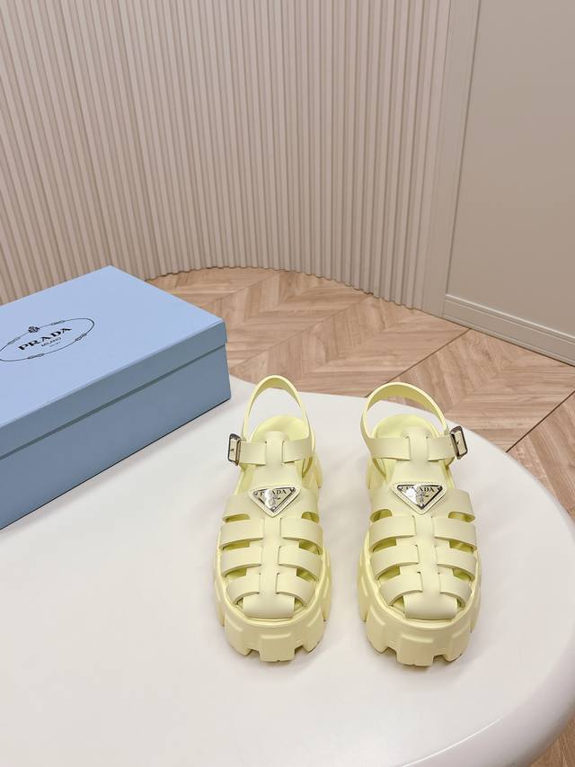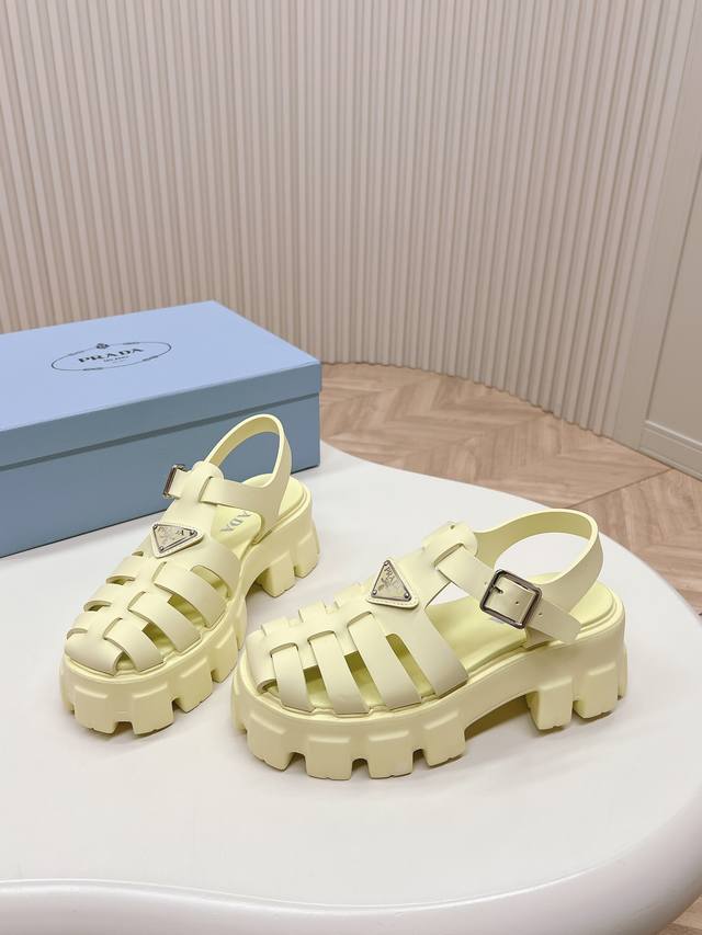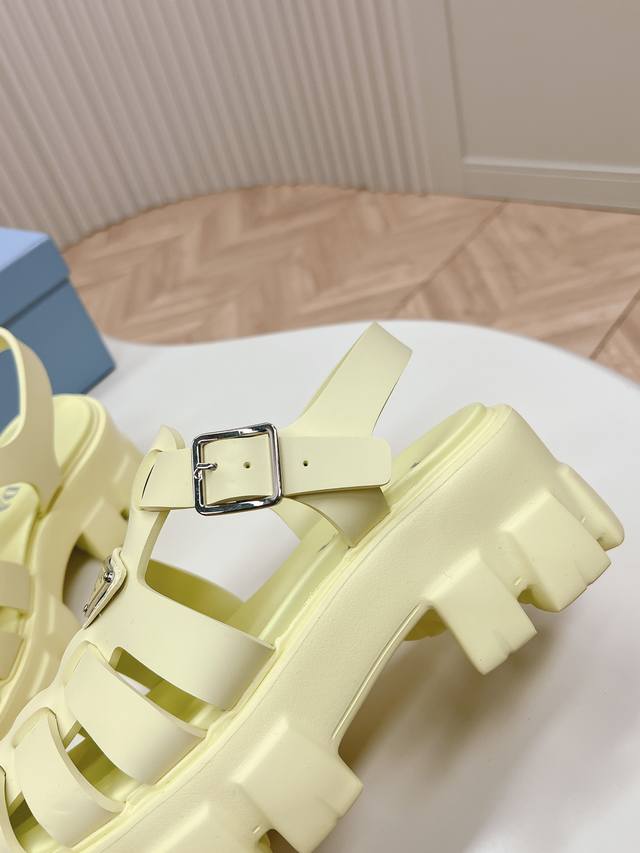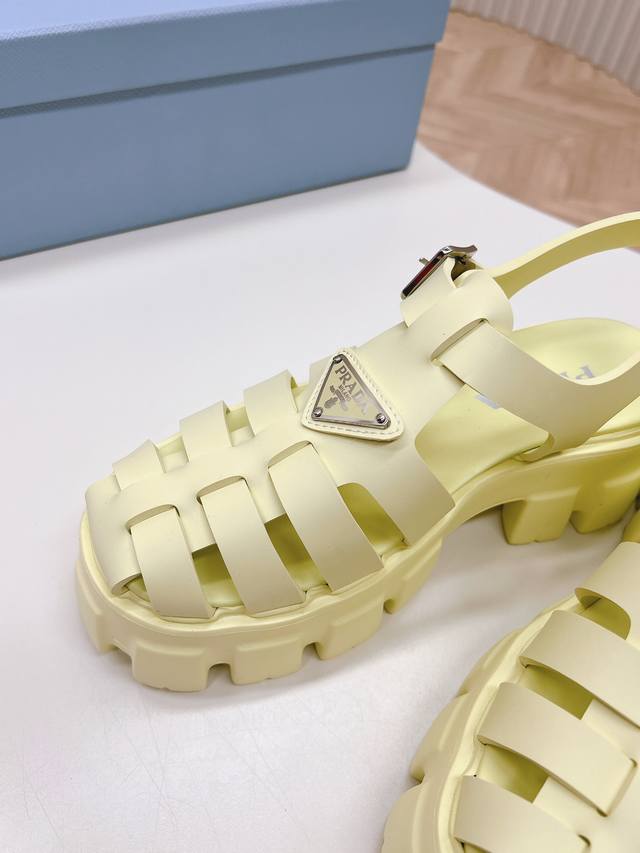 全色系升级 Prada 普拉达猪笼鞋锯齿罗马编织厚底橡胶凉鞋 复古时髦前卫的轮齿55Mm 厚底鞋底搭配橡胶鞋面,让整双鞋轻便舒适 鲜艳色彩 满足不同风格时髦人士的多种选择! 标志性金属三角标搭配古沙滩凉鞋造型,每一个设计元素都踩在时髦点上! 码数35-40