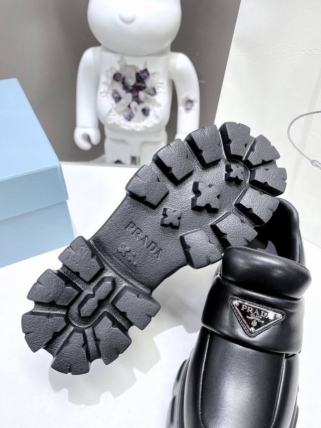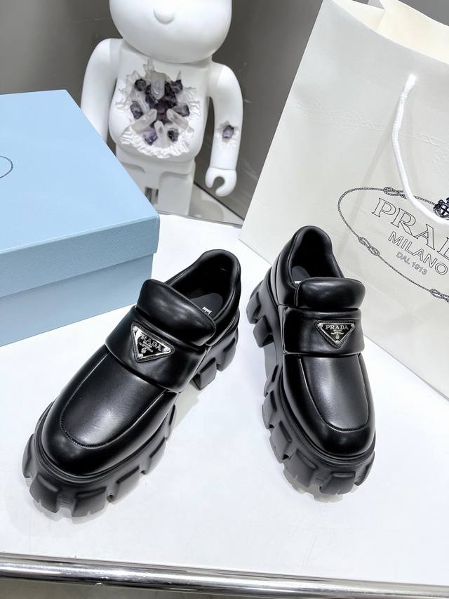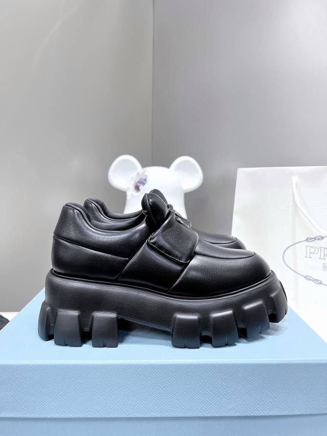 / 出厂价P ,最高版本 普拉达新款黑色超软头层小牛皮厚底休闲小皮鞋,刘雯众多网红上脚,Prad这款松糕厚底鞋今年非常爆,穿上 增高 休闲两不失误,清爽的表现足以表