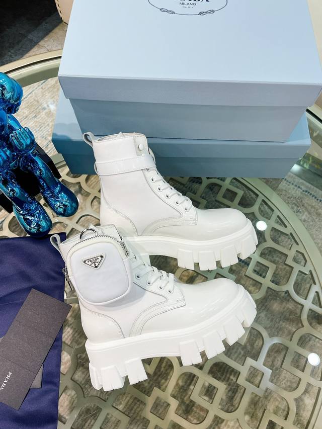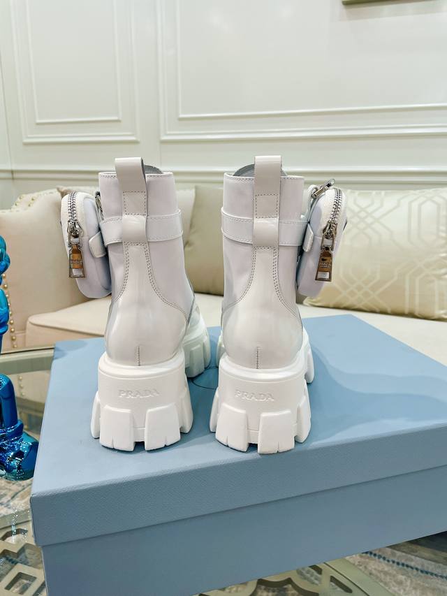 P家最新款 面:进口开边珠、小牛皮 里:进口混种羊皮 垫:混种羊皮 底:原版工艺大底 厚6Cm 标志性三角标,原版包装 Size:35-41...