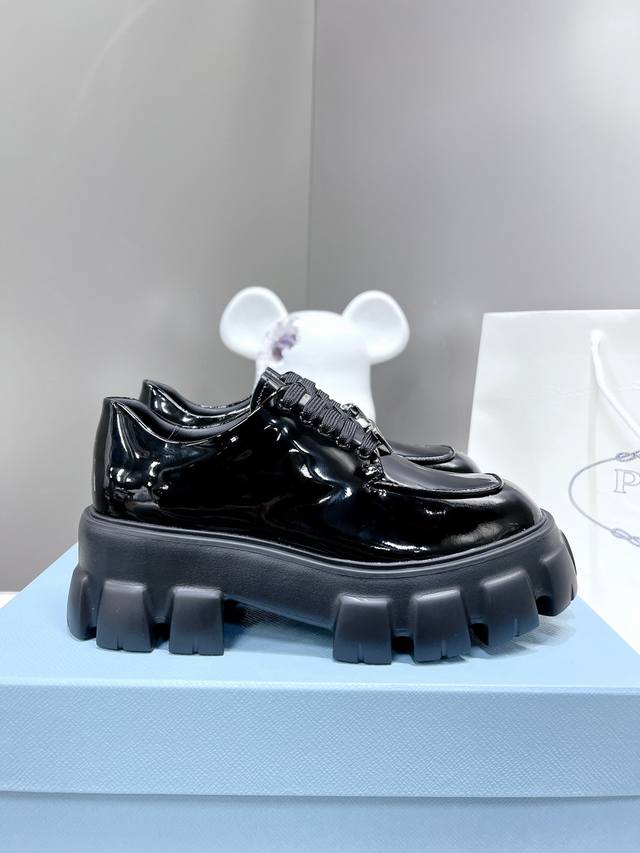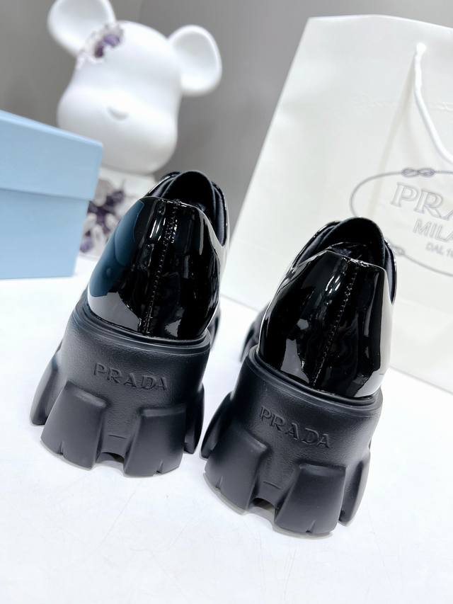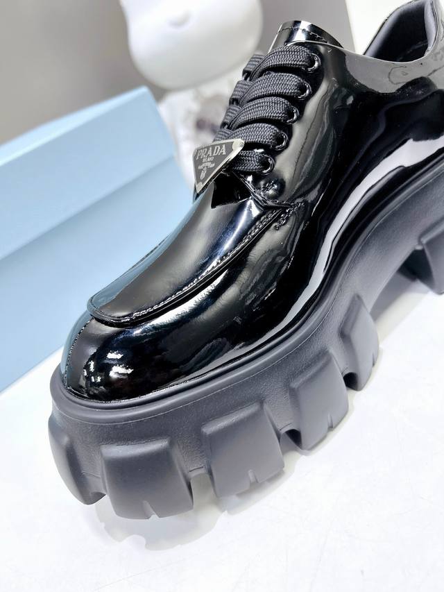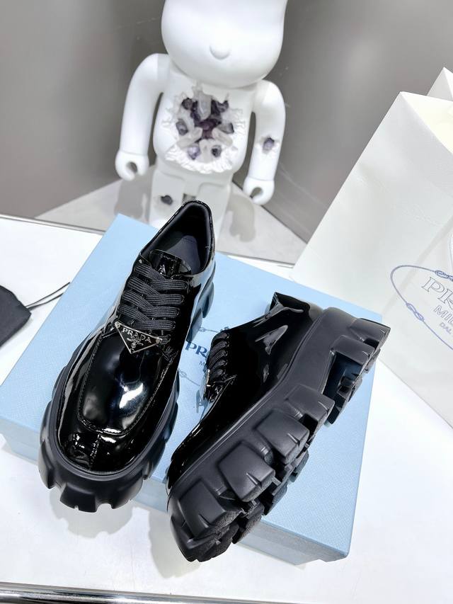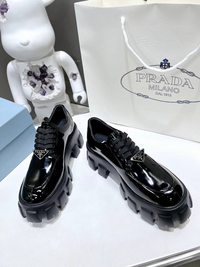 / 出厂价P ,高版本 普拉达新款黑色开边珠小牛皮+牛皮垫脚厚底休闲小皮鞋,刘雯众多网红上脚,Prad这款松糕厚底鞋今年非常爆,穿上 增高 休闲两不失误,清爽的表现