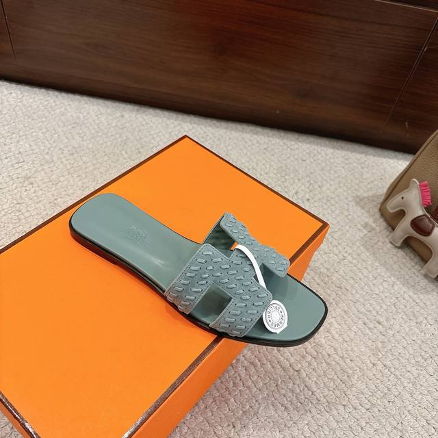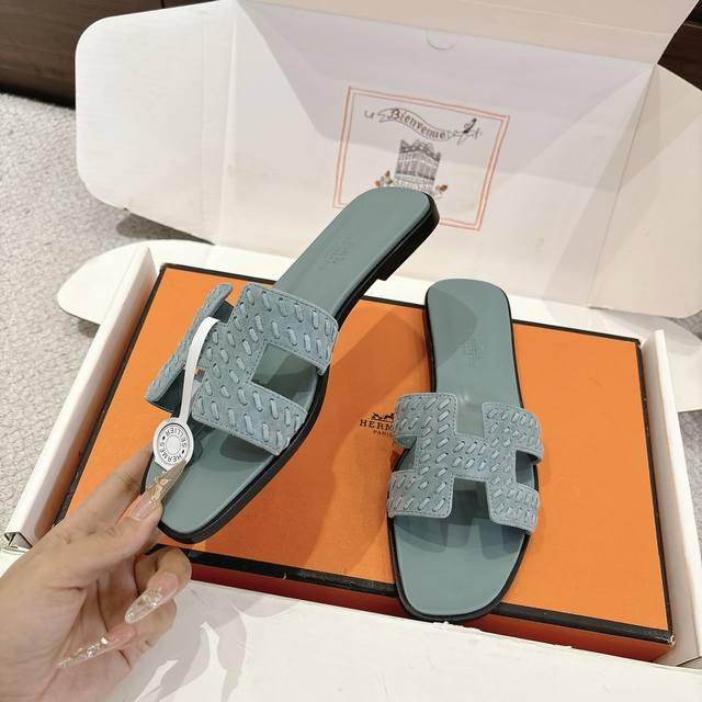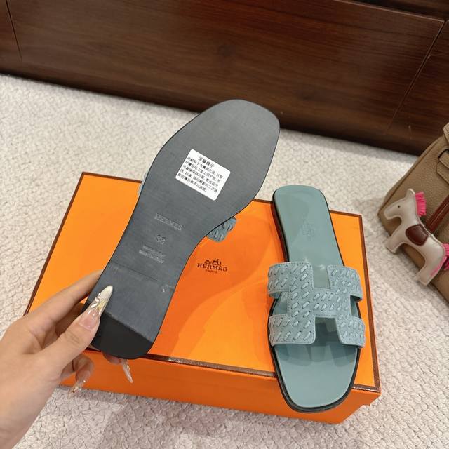 出厂价P Hermes 爱马仕H拖鞋Oran凉鞋系列 时尚又百搭 超级舒服 每个细节都做到极致 原版细腻麂皮面料 原版1:1独家私模鞋面 原版真皮沿条大底 包装: 每对鞋均配有两条H家系列丝巾 Size:34~42 34.40.41.42.43定制不退不换