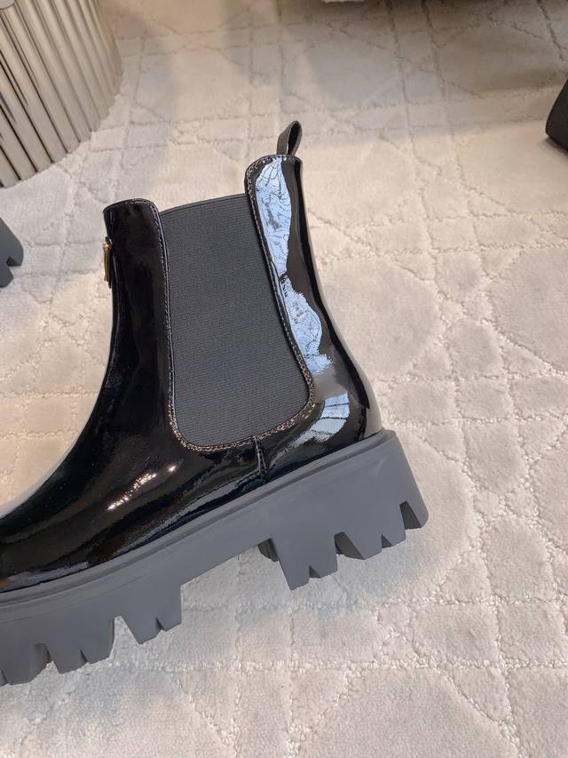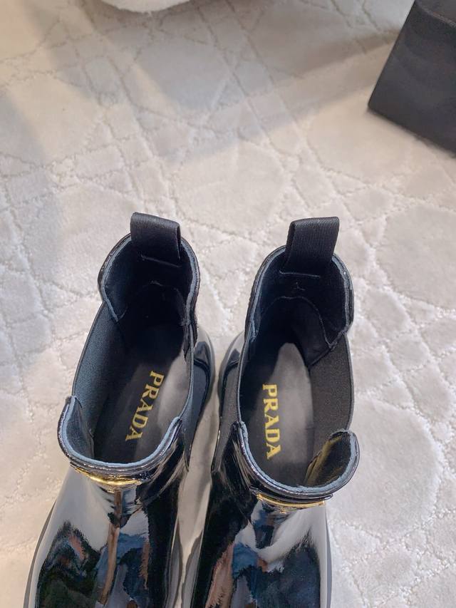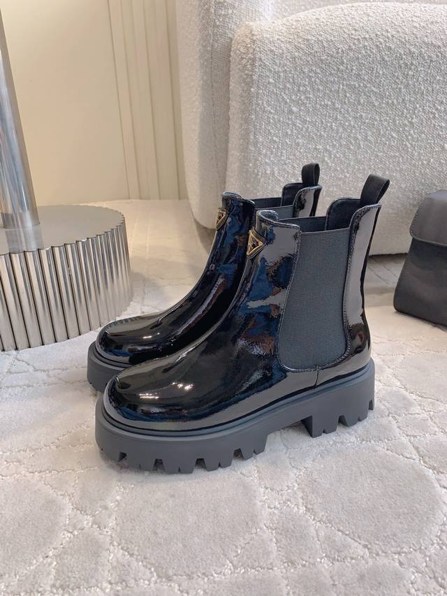 出厂价P Prad*新款三角标厚底短靴 经典三角标装饰 鞋型流畅帅气 超好穿 上脚简直酷炸了 万年百搭靴 鞋面小牛皮 原版开模三角标 内里垫脚牛皮 原版开模大底 尺码35-39 40 41定做