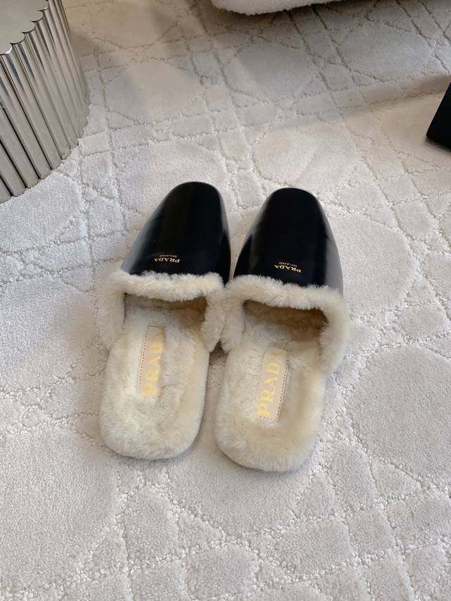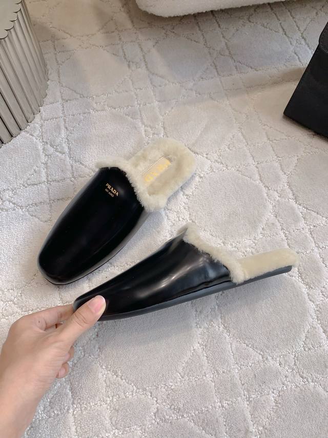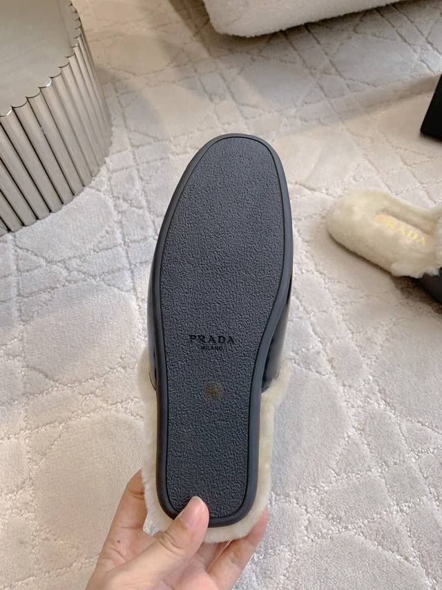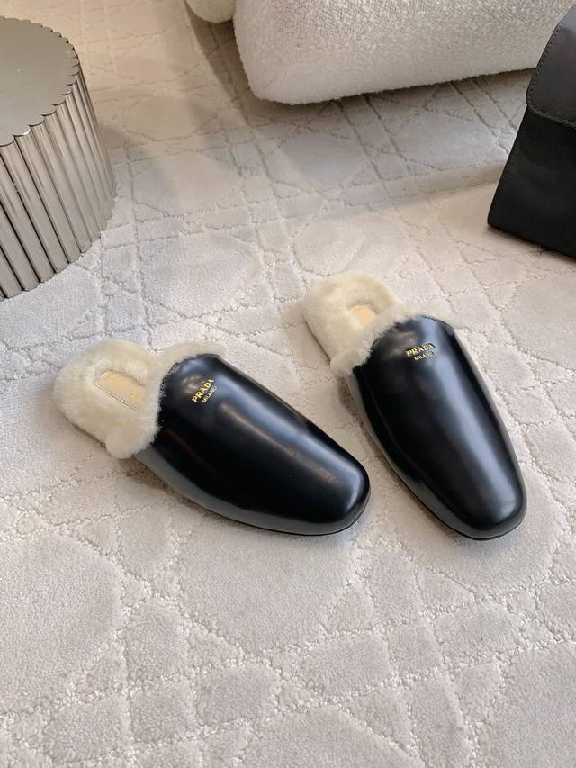 / 出厂价P Prad*新款羊毛里平底穆勒半拖鞋 简约时尚 尽显极简高级感 脚感超级舒适 超级保暖 鞋面小牛皮 羊京 内里垫脚进口羊毛 原版开模大底 尺码35-39