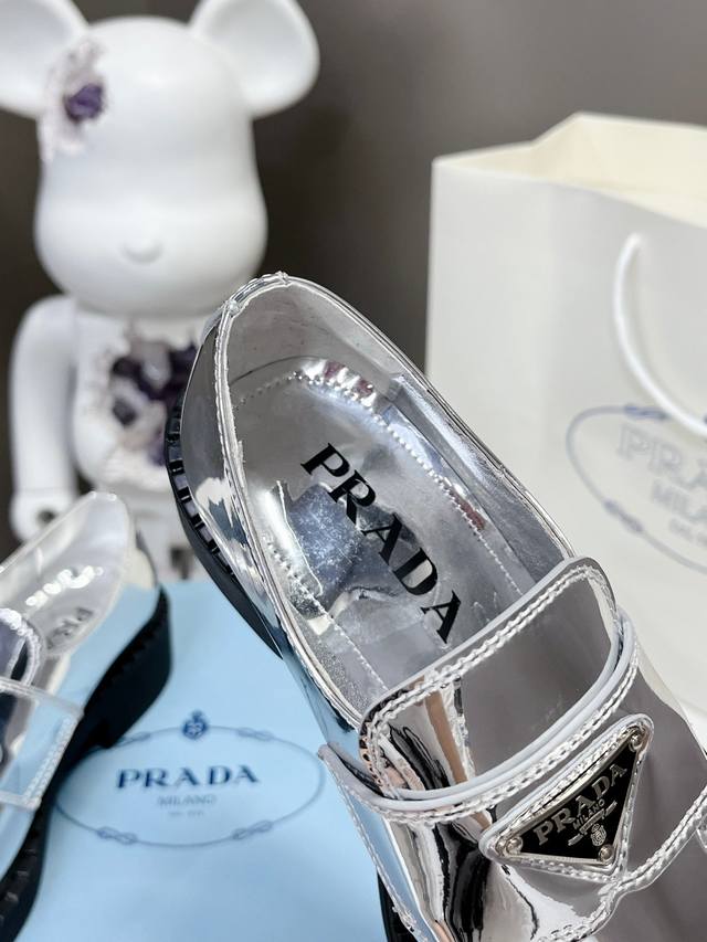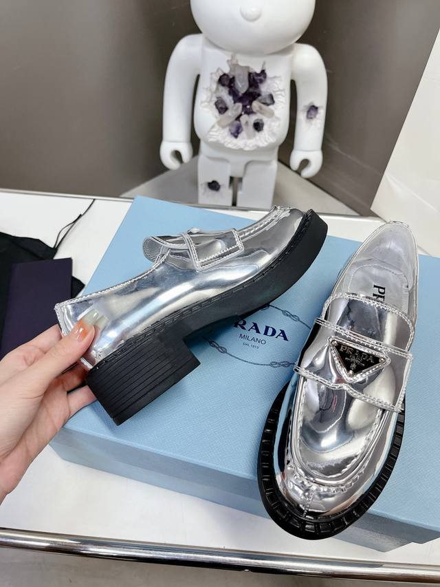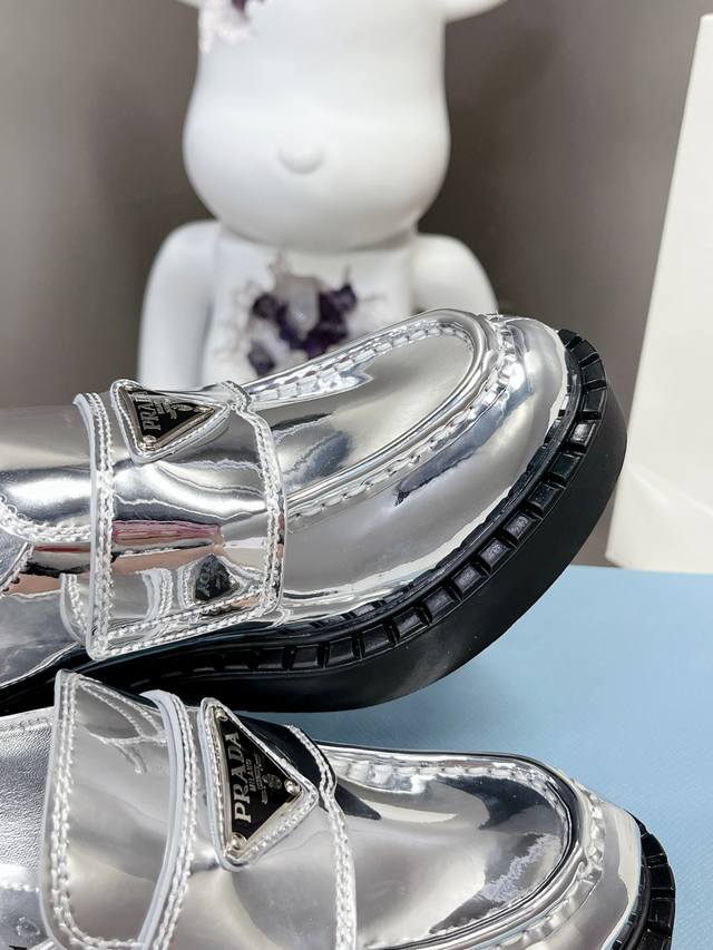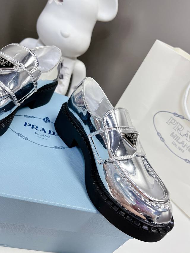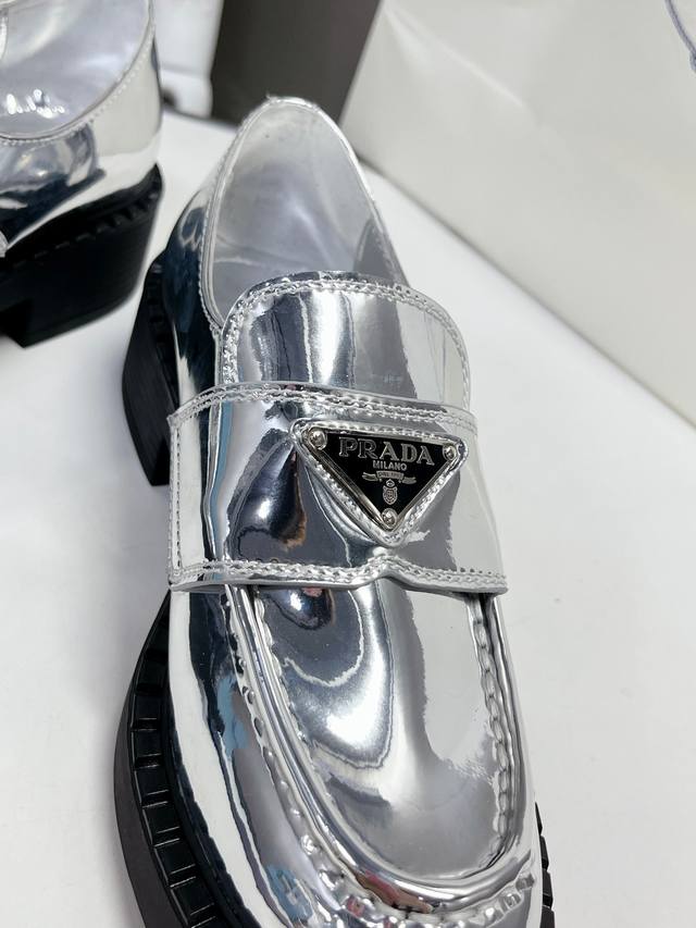 / 出厂价P Prada 普拉达 春夏金色银色乐福鞋新品 延续经典乐福鞋造型,采用金属光泽材质,特别的视觉冲击感,时髦又好穿! 原版鞋型,进口金属牛皮材质 Size