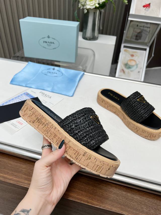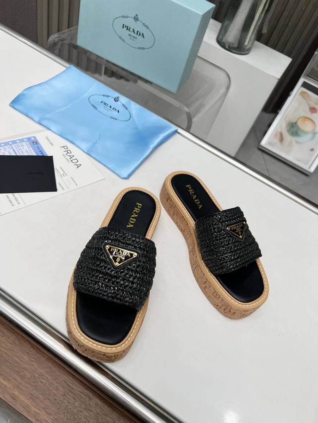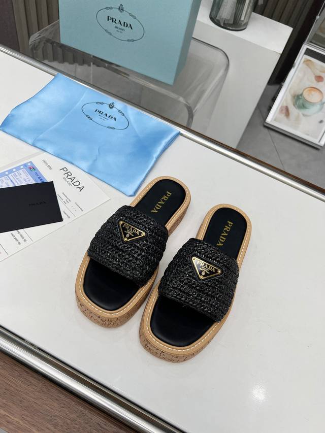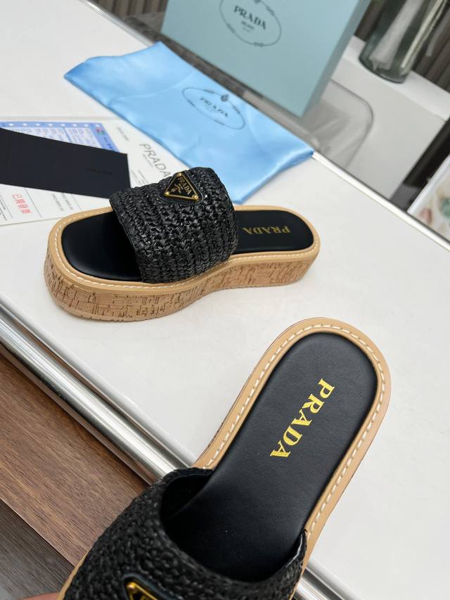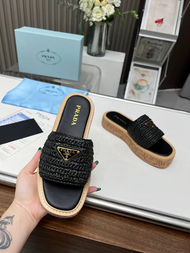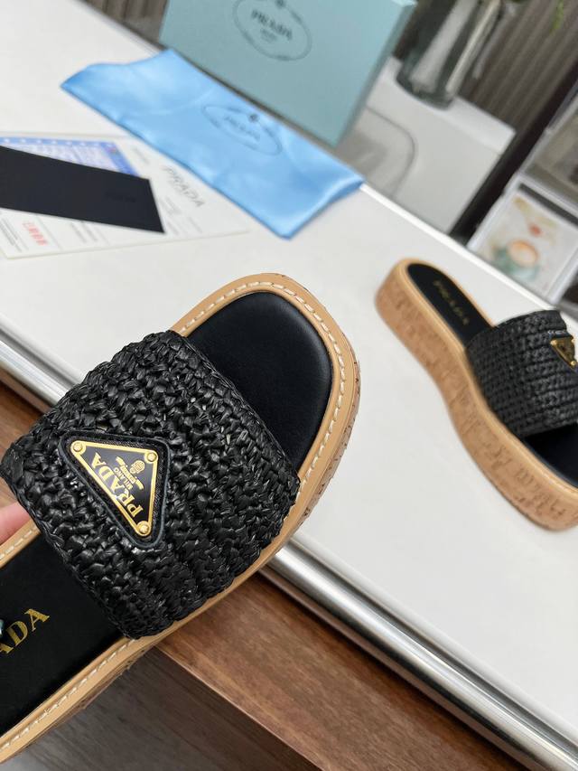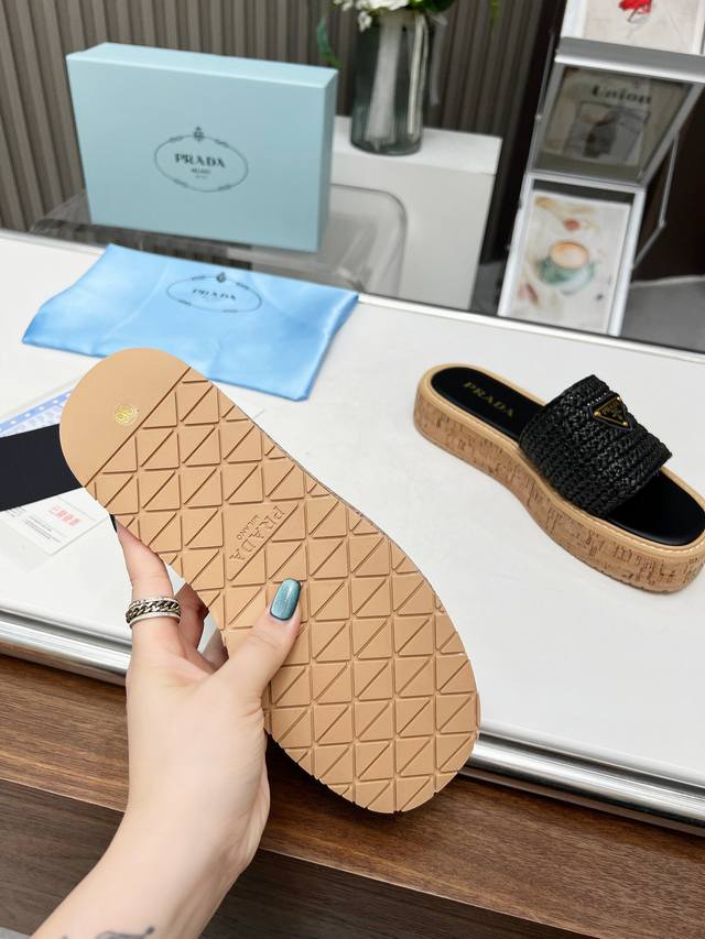 出厂 Prada 升级版 高品质高版本 超火厚底凉鞋 超火爆最新春夏锯齿罗马编织超轻厚底 凉鞋!复古时髦前卫的轮齿 让整双鞋轻便舒适鲜艳色彩满足不同风格时髦人士的多种选择标志性金属三角标搭配古沙滩凉鞋造型,每一个 元素都踩在时髦点上! 鞋面: 原版定制拉菲草 内里: 小牛皮 跟高: 3.5Cm Size: 35-40 41 42定做
