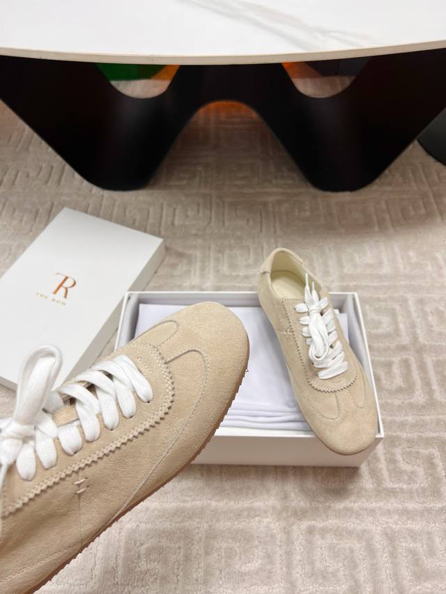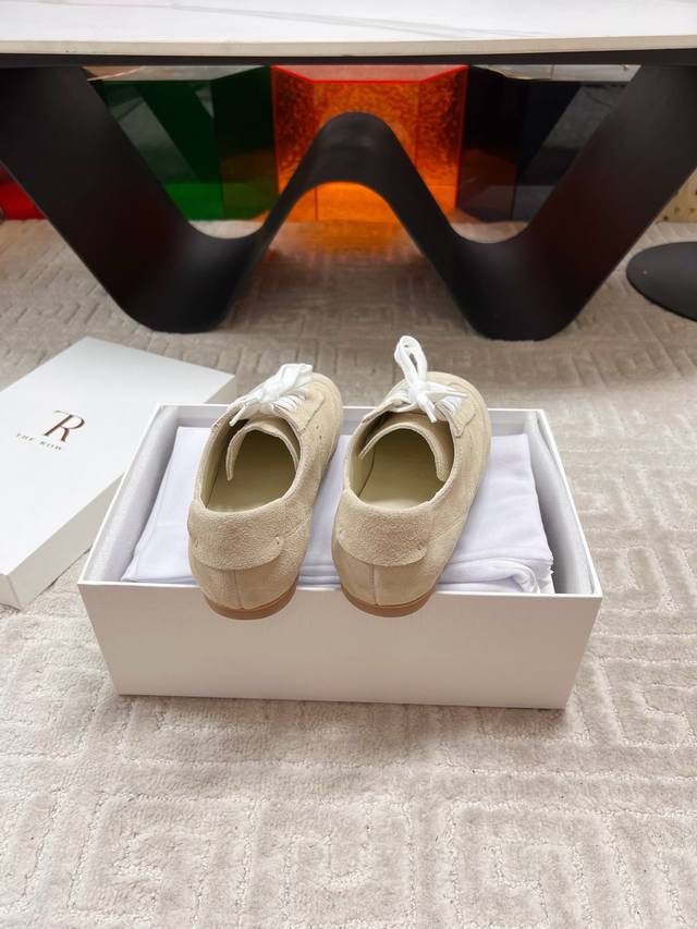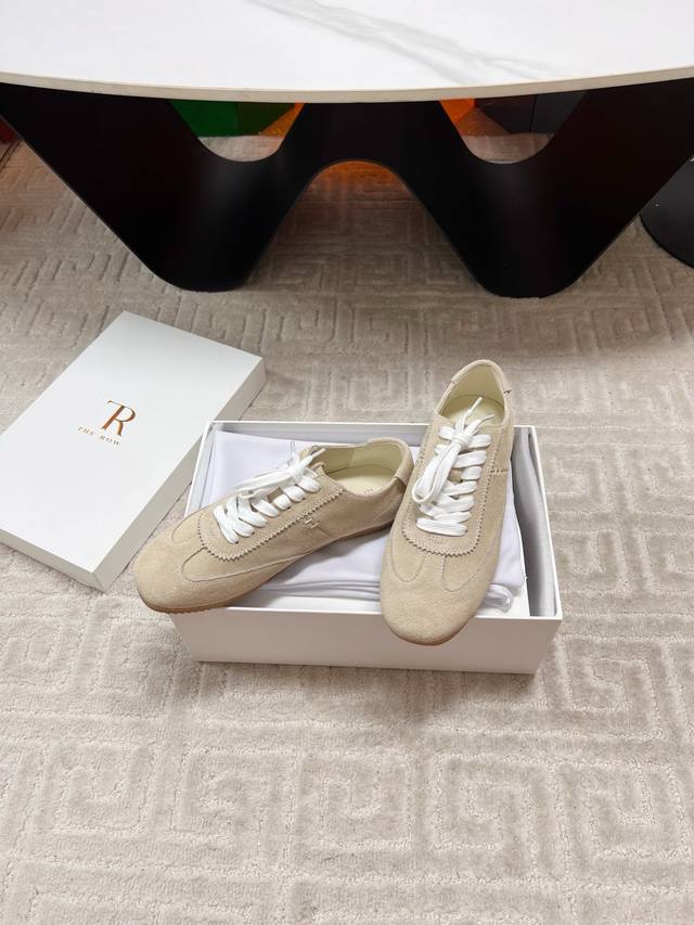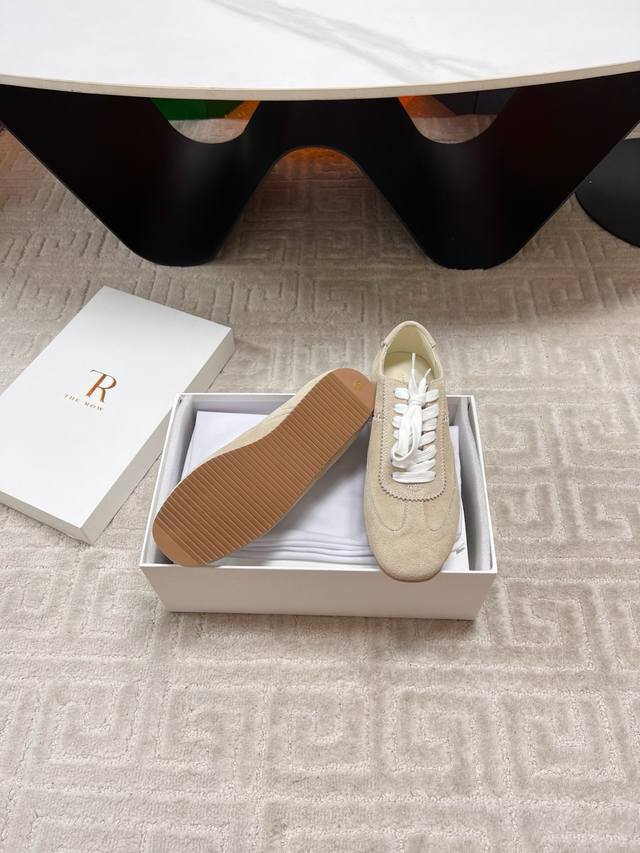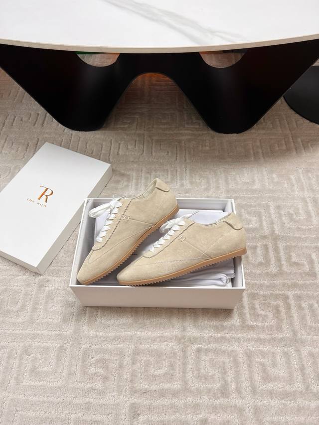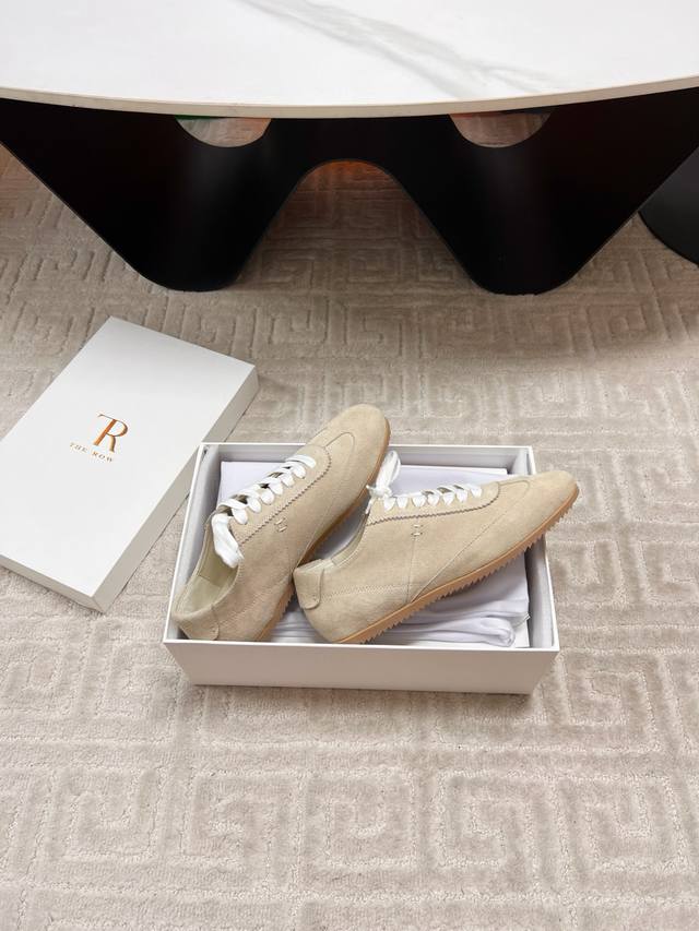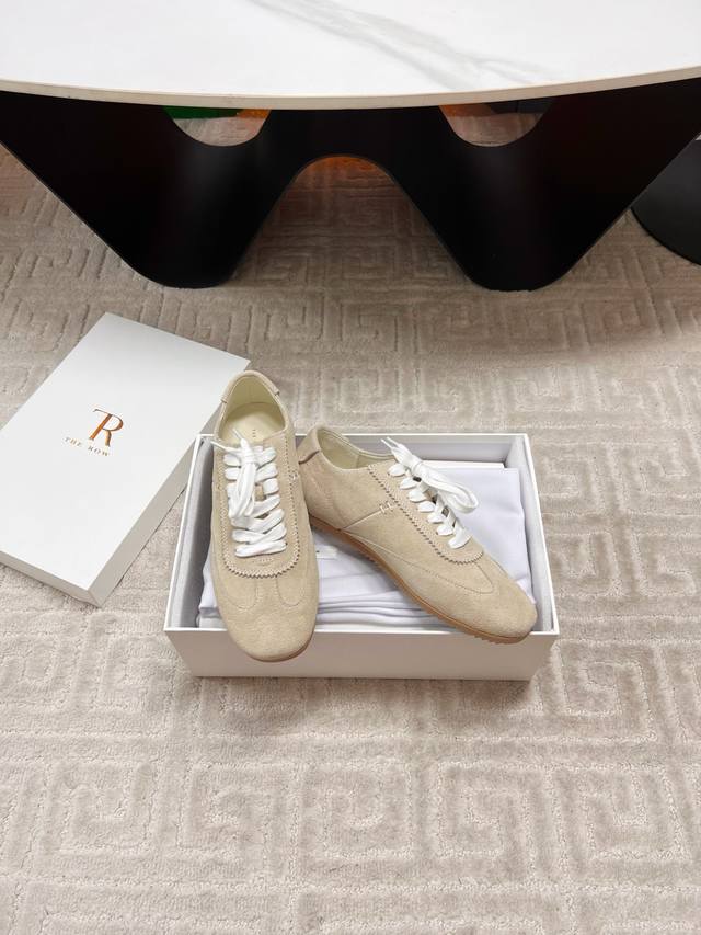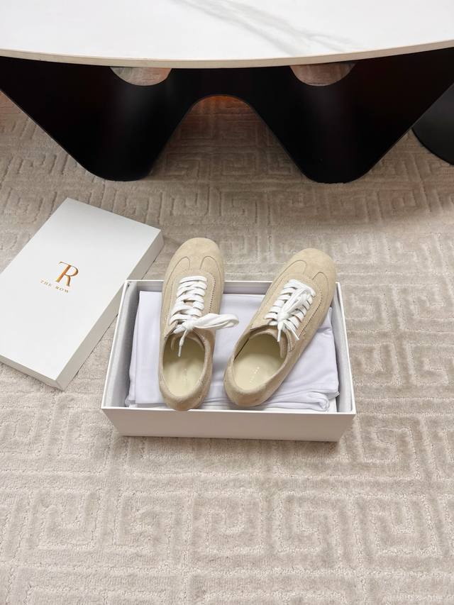 / 出厂 The Row26春夏新款极简主义拼色系带休闲鞋阿甘德训鞋! 这款低帮运动鞋是打造极简主义休闲夏日衣橱的理想穿搭之选,采用麂皮鞋面和同色系橡胶鞋底设计,优
