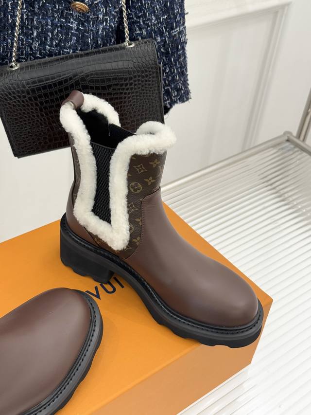 厂价 驴牌25Wf秋冬新品老花羊毛边切尔西 厚底短靴 当切尔西靴的利落廓形碰撞Lv百年基因 这款短靴以 复古暖意 重构奢华靴履定义 让经典元素在寒风中绽放格调张力。 鞋口一圈天然羊毛边轻盈包裹脚踝 既抵御-10℃低温侵袭 又为硬朗靴型注入暖冬温柔 与鞋身老花帆皮饰边形成刚柔碰撞。 每处细节都藏着百年工艺积淀 。 都是老花图腾与羊毛暖意的共生, 让秋冬出行既有奢感 又不失温暖妥帖。 面料采用原版定制小牛皮 内里垫脚均为羊皮 原版开模定制防滑大底 Size:35-39 40 41定制