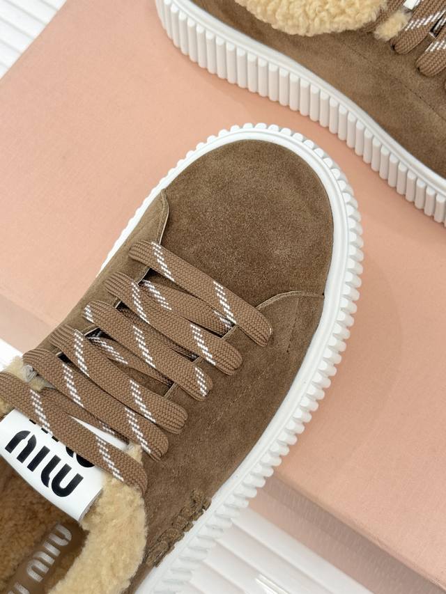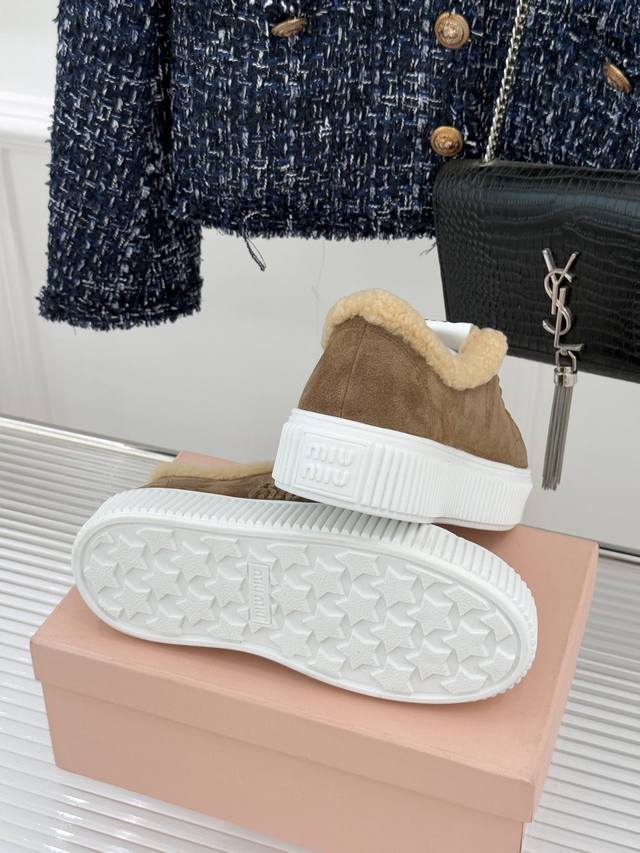 厂价 Miu Miu 缪缪25Wf新品羊毛休闲 厚底饼干鞋 当羊毛的暖糯邂逅饼干鞋的复古基因 这双饼干鞋鞋便成了甜酷少女的冬日专属 标志性的波浪纹厚底复刻经典饼干轮廓 约3.5Cm的鞋跟悄悄拉长腿部线条 小个子也能轻松拥有优越比例。 鞋面甄选细腻羊毛材质,温柔包裹双脚, 搭配羊皮毛一体内里 将暖意牢牢锁在鞋内 北方的寒冬也能肆意出行 鞋舌与鞋跟处印刷徽标 低调泄露品牌身份 与圆润鞋头相得益彰 尽显乖巧少女感 橡胶五角星纹路大底兼顾防滑与回弹 行走时轻盈无负担 逛街暴走也不会累脚。 无论是搭配卫裤、牛仔裤打