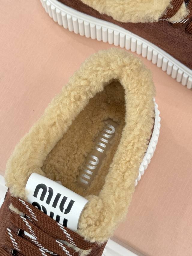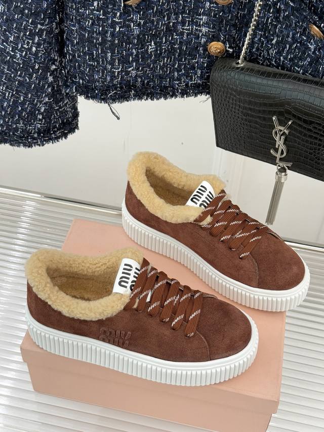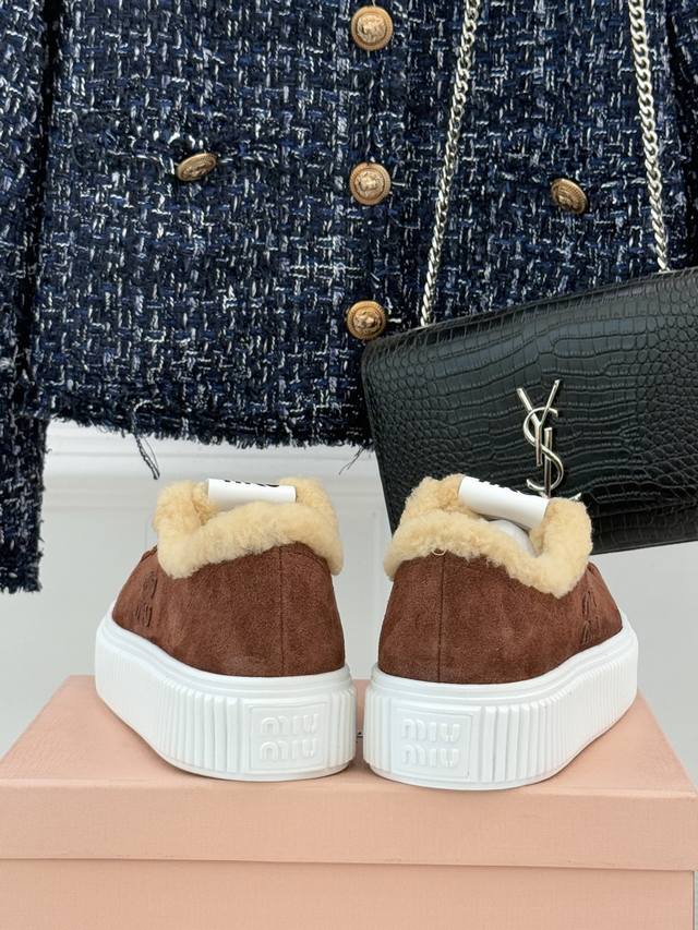 厂价 Miu Miu 缪缪25Wf新品羊毛休闲 厚底饼干鞋 当羊毛的暖糯邂逅饼干鞋的复古基因 这双饼干鞋鞋便成了甜酷少女的冬日专属 标志性的波浪纹厚底复刻经典饼干轮廓 约3.5Cm的鞋跟悄悄拉长腿部线条 小个子也能轻松拥有优越比例。 鞋面甄选细腻羊毛材质,温柔包裹双脚, 搭配羊皮毛一体内里 将暖意牢牢锁在鞋内 北方的寒冬也能肆意出行 鞋舌与鞋跟处印刷徽标 低调泄露品牌身份 与圆润鞋头相得益彰 尽显乖巧少女感 橡胶五角星纹路大底兼顾防滑与回弹 行走时轻盈无负担 逛街暴走也不会累脚。 无论是搭配卫裤、牛仔裤打